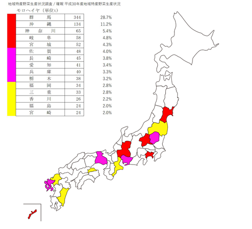 日本での生産量の多い県を並べてみます。H30農水資料をもとに制作。