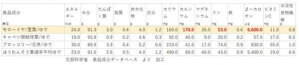 「βカロテン」がとても豊富。リンなども重量ベースでは優良な栄養成分をもった野菜だとわかります。