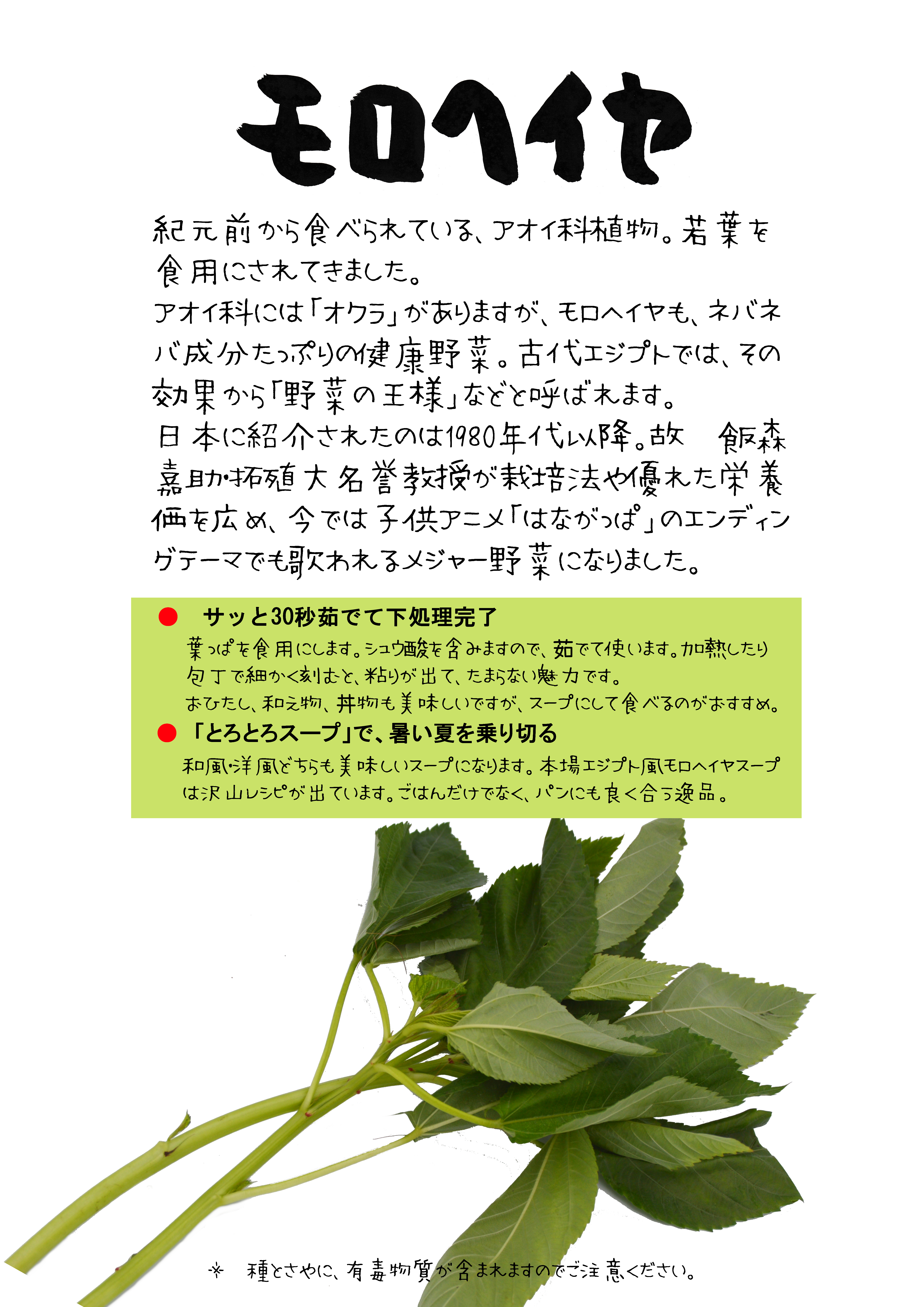 故 飯森嘉助氏(拓殖大学名誉教授・アラビア語学者)が、モロヘイヤの紹介と普及に努め、1980年代「全国モロヘイヤ普及協会」を設立します。栽培法から食べ方、優位性などを説いて、現在の食卓にのぼるまでに普及活動をしてきた経緯があります。
