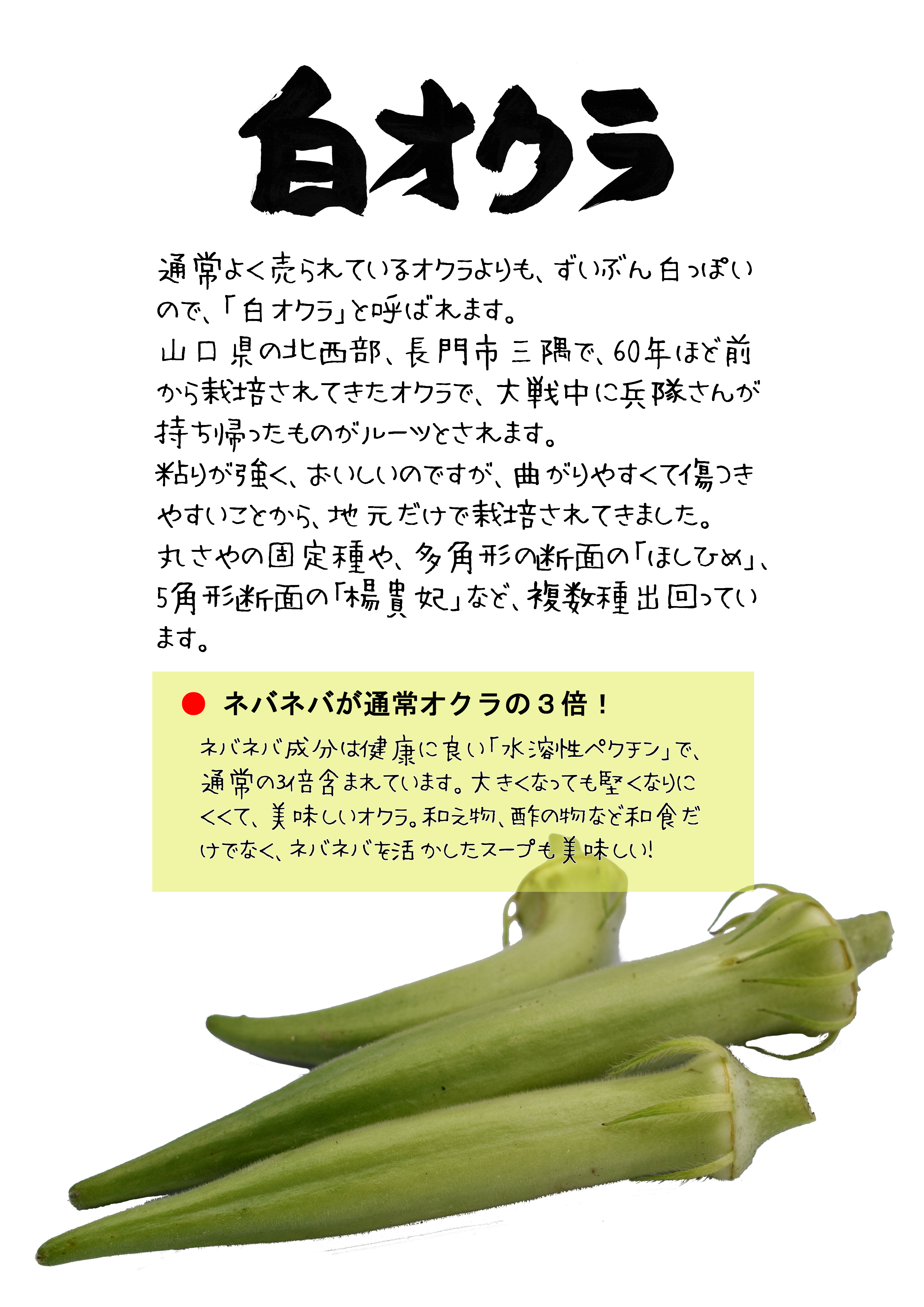 通常みる緑のオクラよりも、ずいぶん白っぽいので、真っ白くはないのですが、「白オクラ」と呼ばれます。