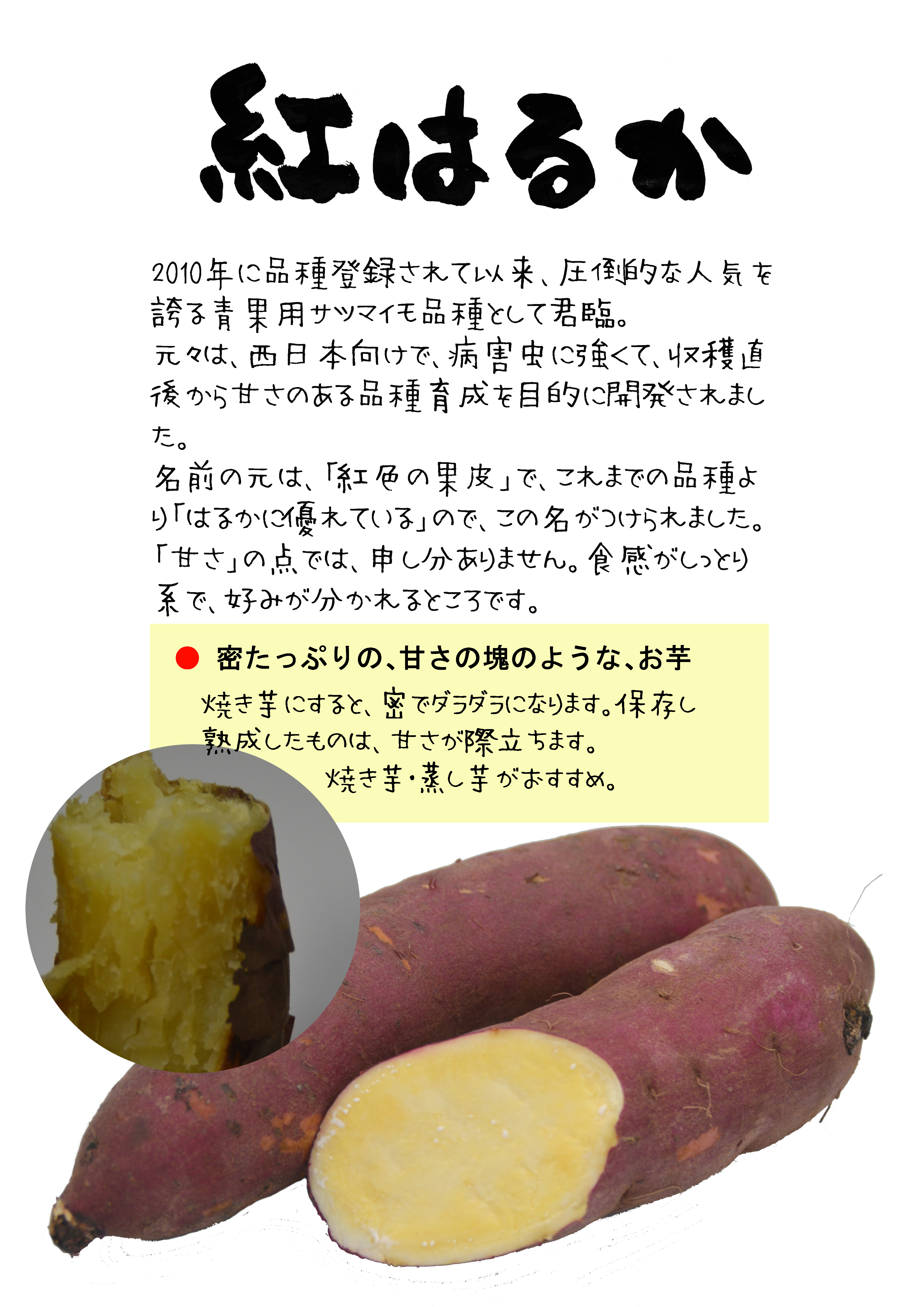 名前の由来は、いもの皮色が赤紫(紅)でこれまでの品種より「はるかに優れている」ことからこの名がついたそうです。