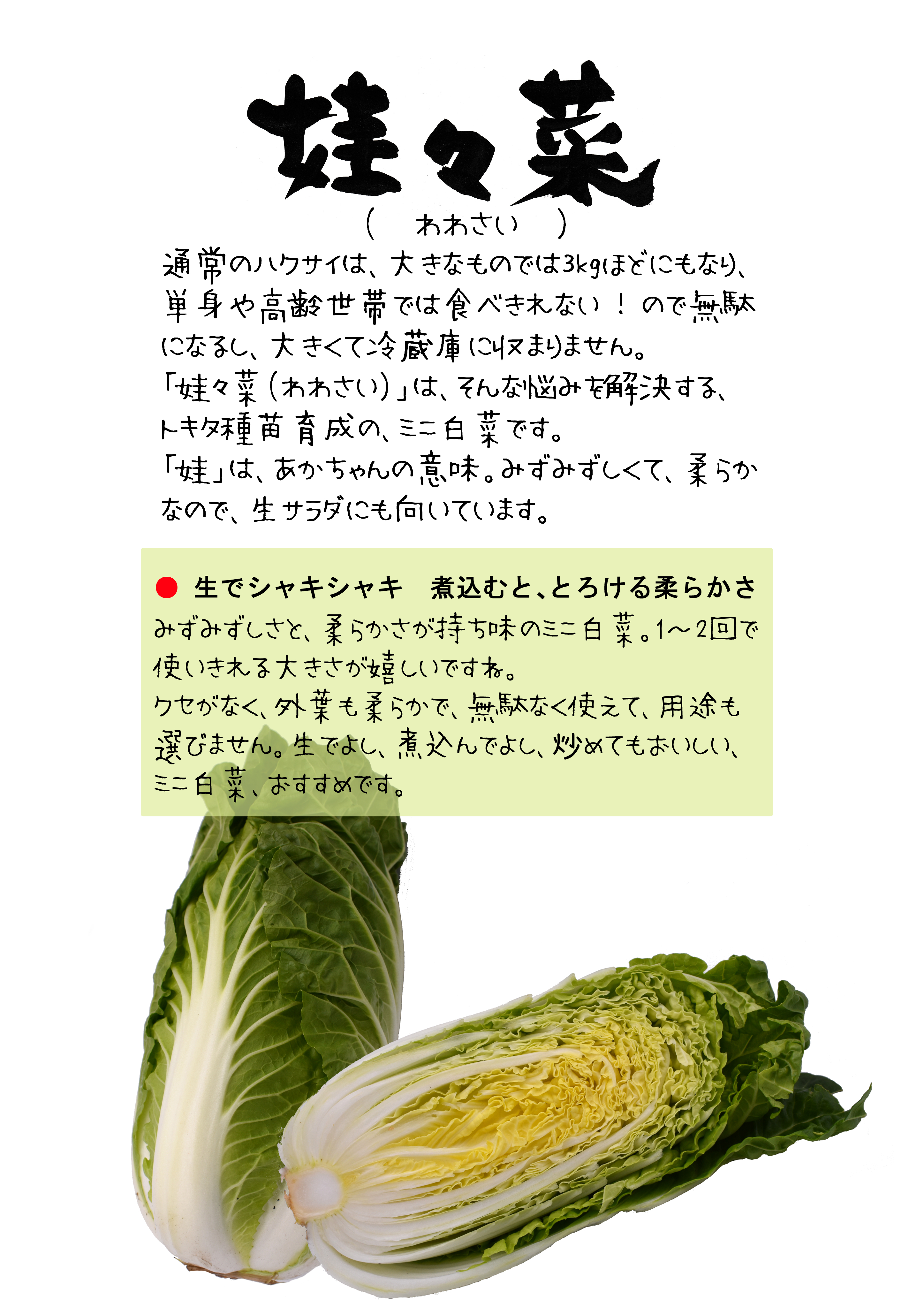ミニ白菜は、「カット白菜は嫌だ」「食材を無駄にしたくない」というニーズに応えています。