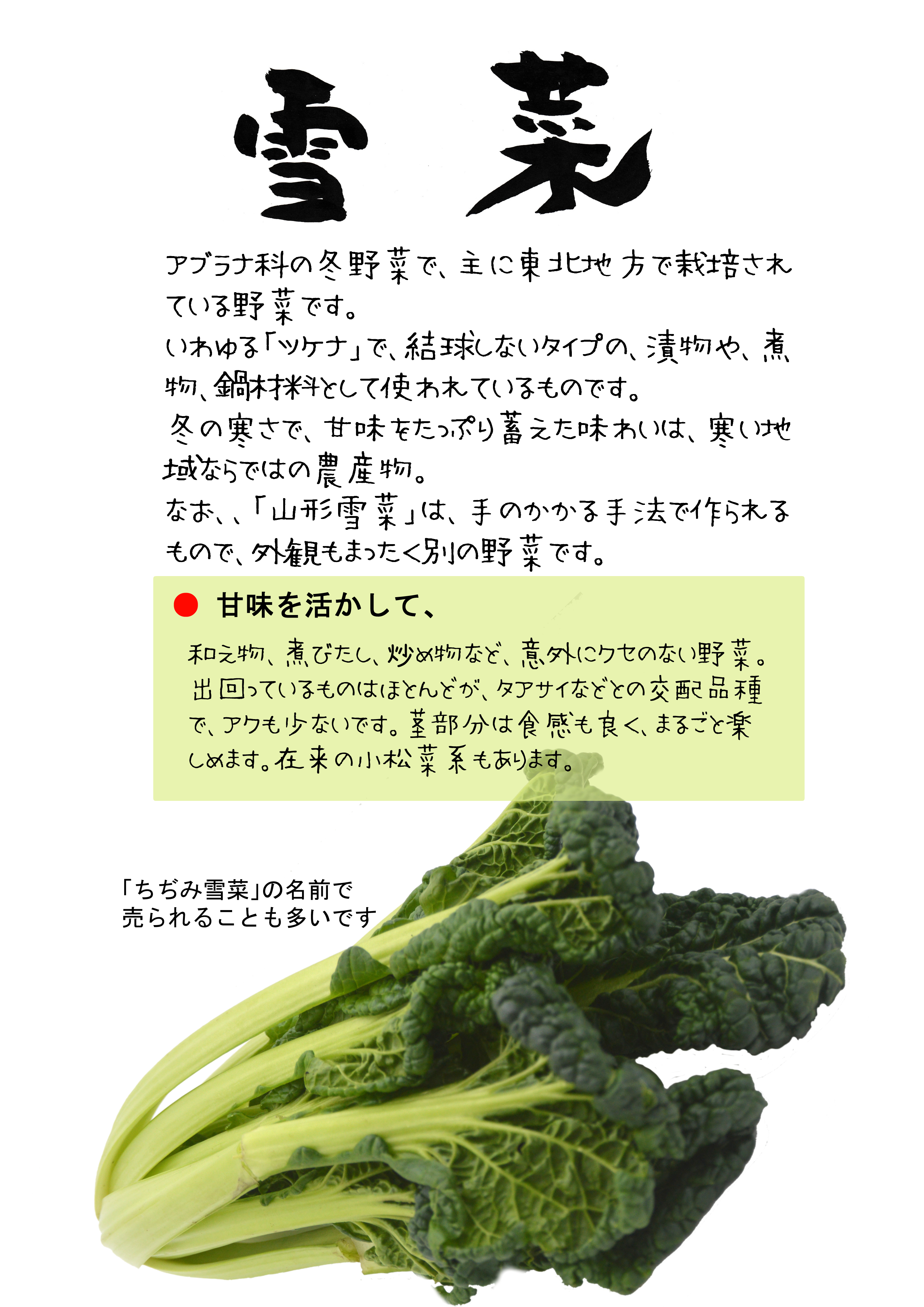 寒さを利用した、「ちぢみ菜」と、通常栽培のものがあって、どちらも「雪菜」と呼んでいます。外観は違うので、混乱しますね。しかも複数の系統。小松菜系とタアサイの系統があります。