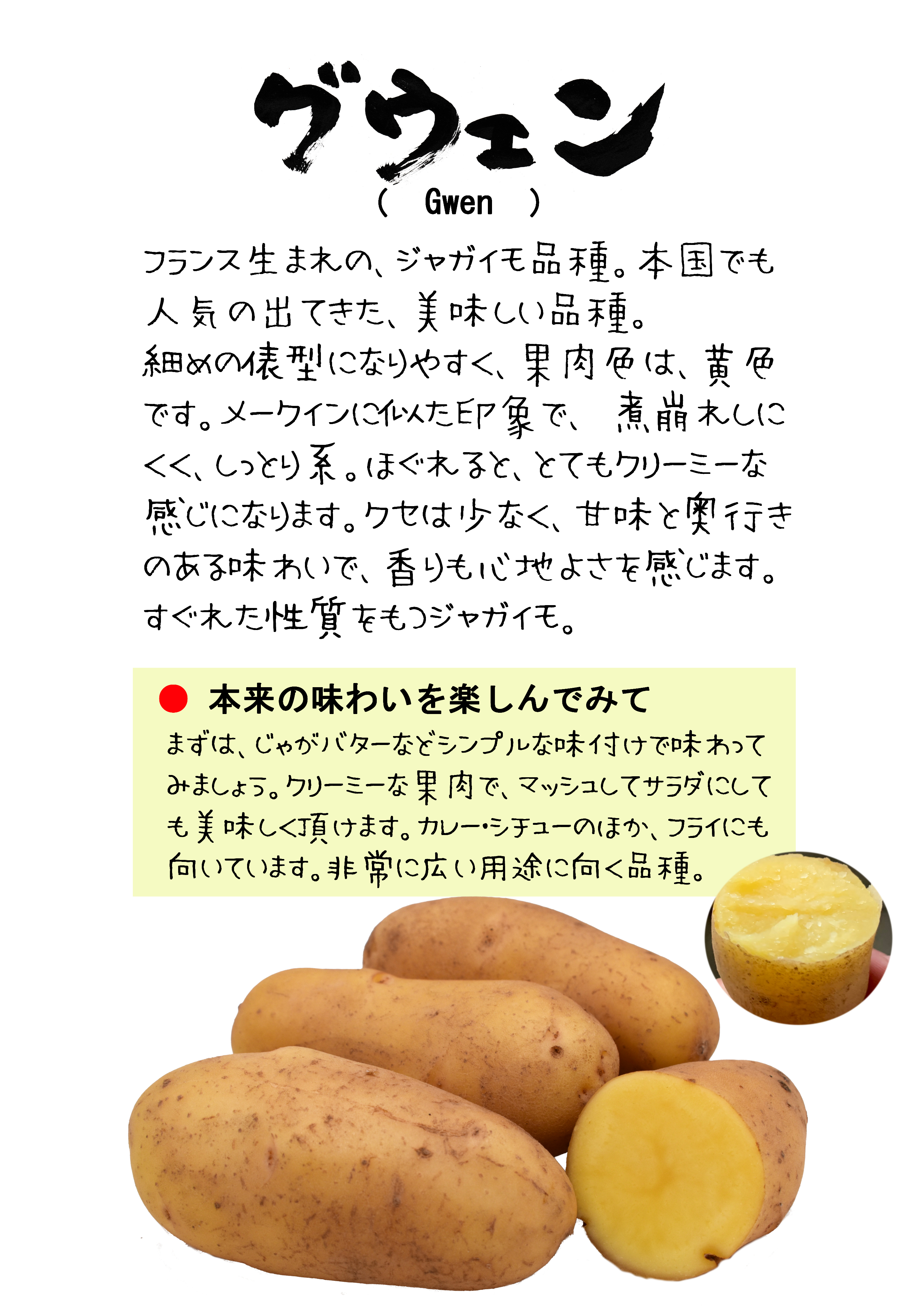エリック・ボネール氏の育成品種で、ほかにもジャガイモ「シンシア」「シェリー」「サッシー」など12品種を農水省に登録しています。