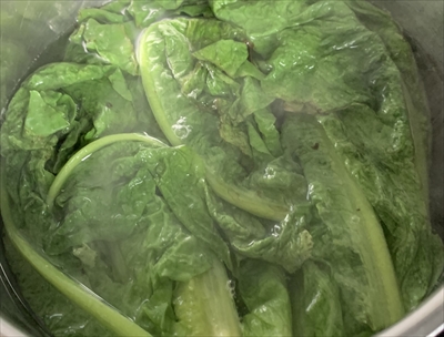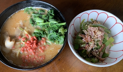 1分ほど茹でて、絞って粗く切ったものを、ラーメンの具にしてみました。
