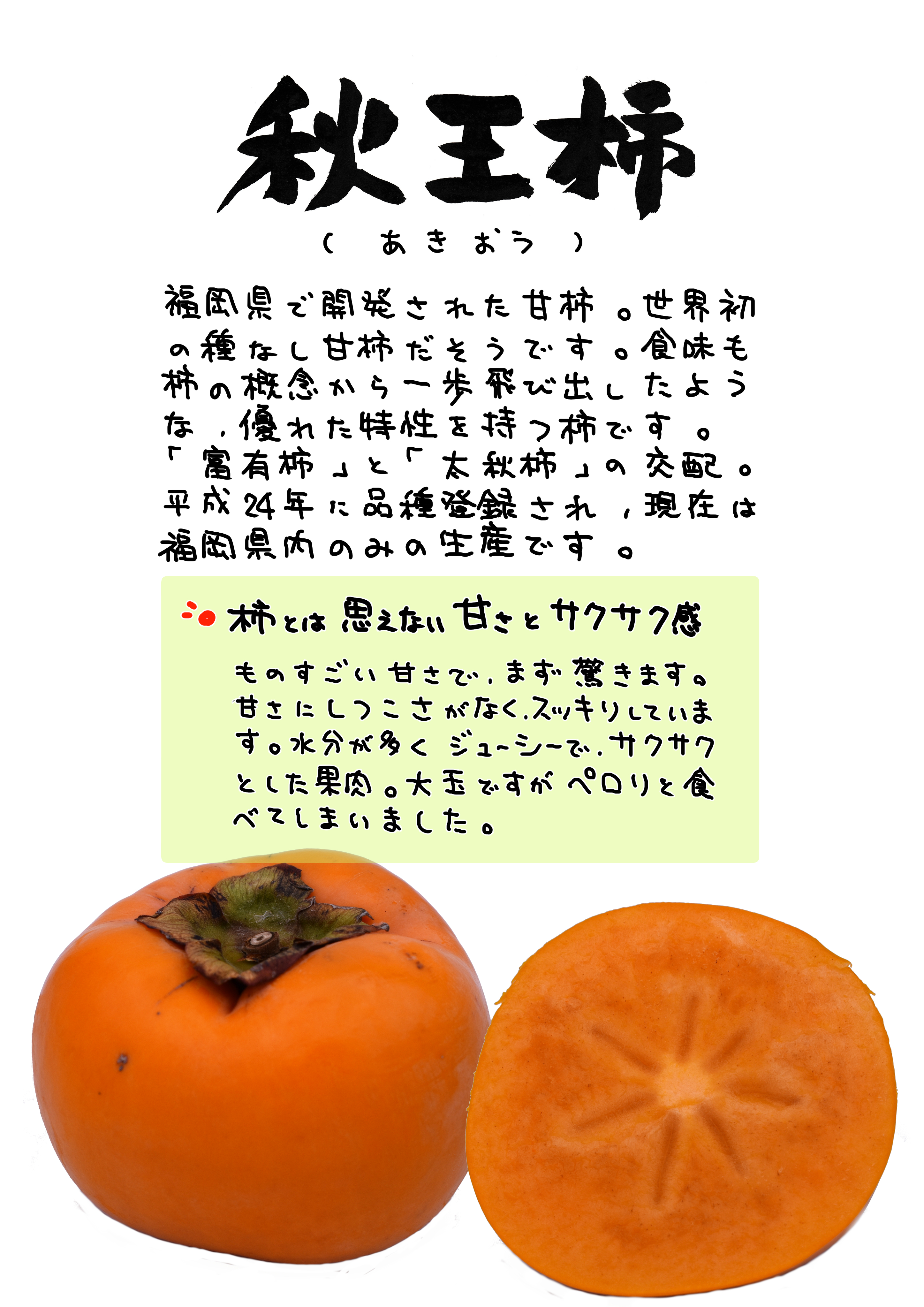 柿らしくない、ともいえる柿で好みのわかれるところですが、とても好感が持てました。ジューシーな感じというのも柿にはあまり存在せず、希少。甘さも、かなりのもので、スッキリ感があります。はっきりとオリジナリティを感じました。親が優良品種。富有柿と太秋柿の組み合わせは、今後も出てくるでしょうね。