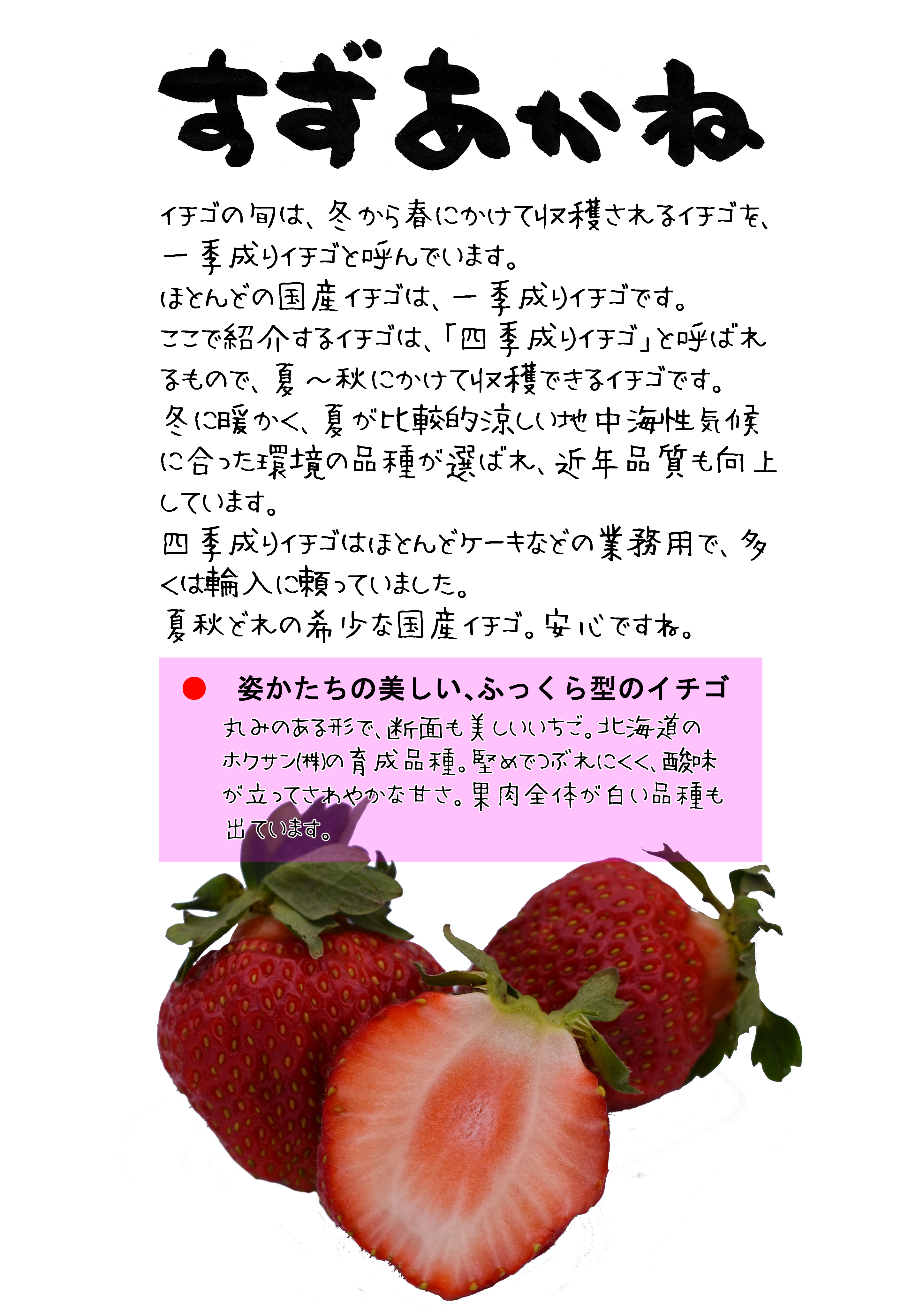 イチゴは、夏期の高温がネックとなることから、夏期に冷涼な北海道や東北、長野などの地域での生産が広まります。