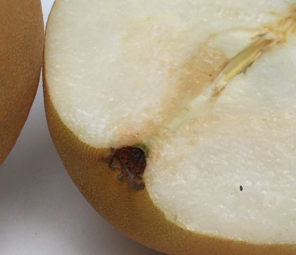 梨の花が咲いて、受粉すると、子房の部分が果実になります。この際、花びらのついている萼(がく)は自然に落ちて無くなるのですが、それが残るという話です。