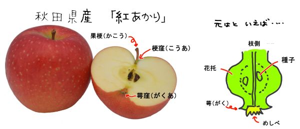 「偽果(ぎか)」と呼ばれ、リンゴ、ナシ、ビワなどで同じような果肉形成をします。