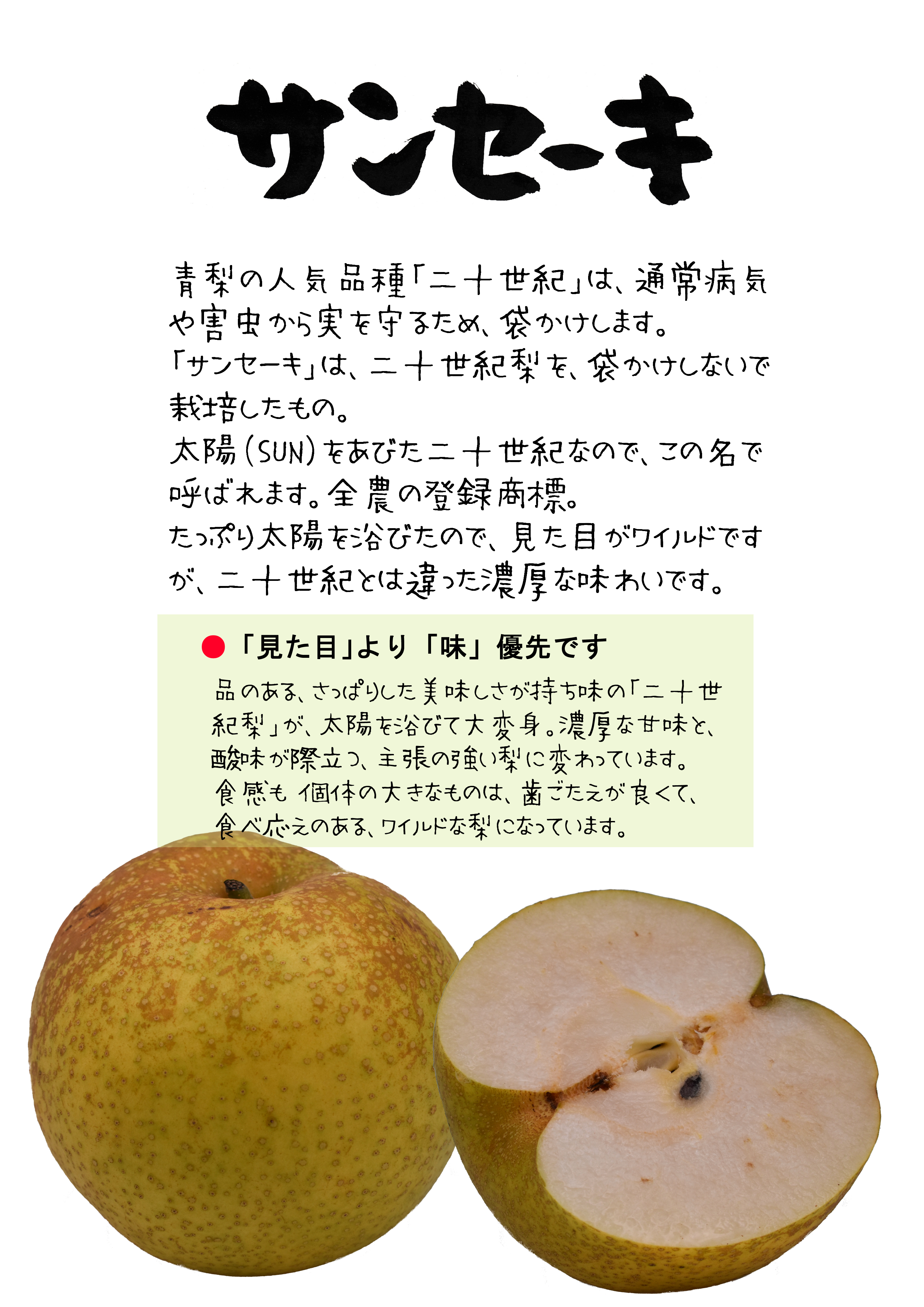 サンセーキは、袋がけをせずに、太陽にじゅうぶん当てることで、糖度の高い、甘い梨に仕上げたものです。