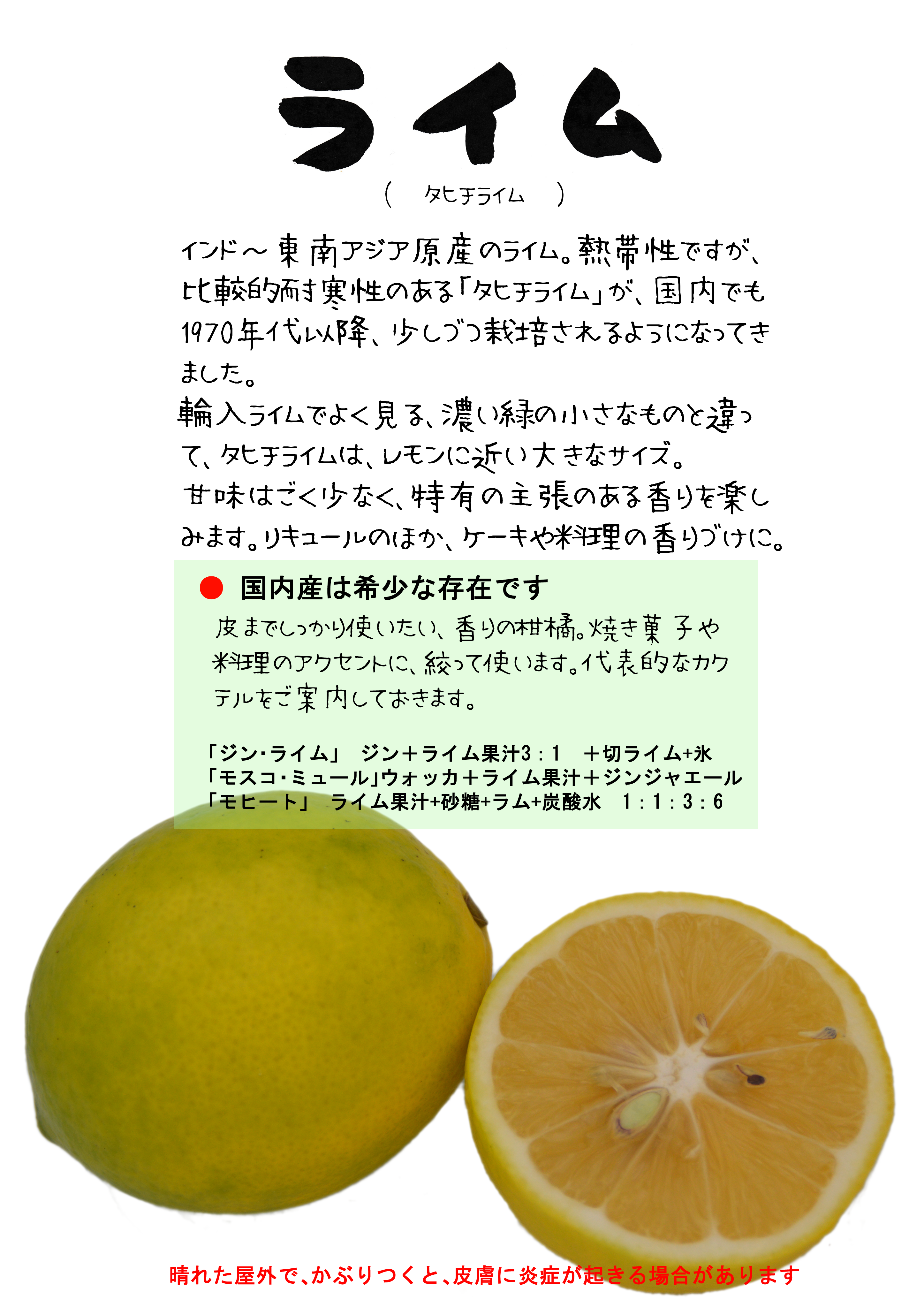 ライムに含まれている、[フロクマリン]という物質で、とくに、日光に浴びると、赤く腫れたり、水疱になる場合があります。