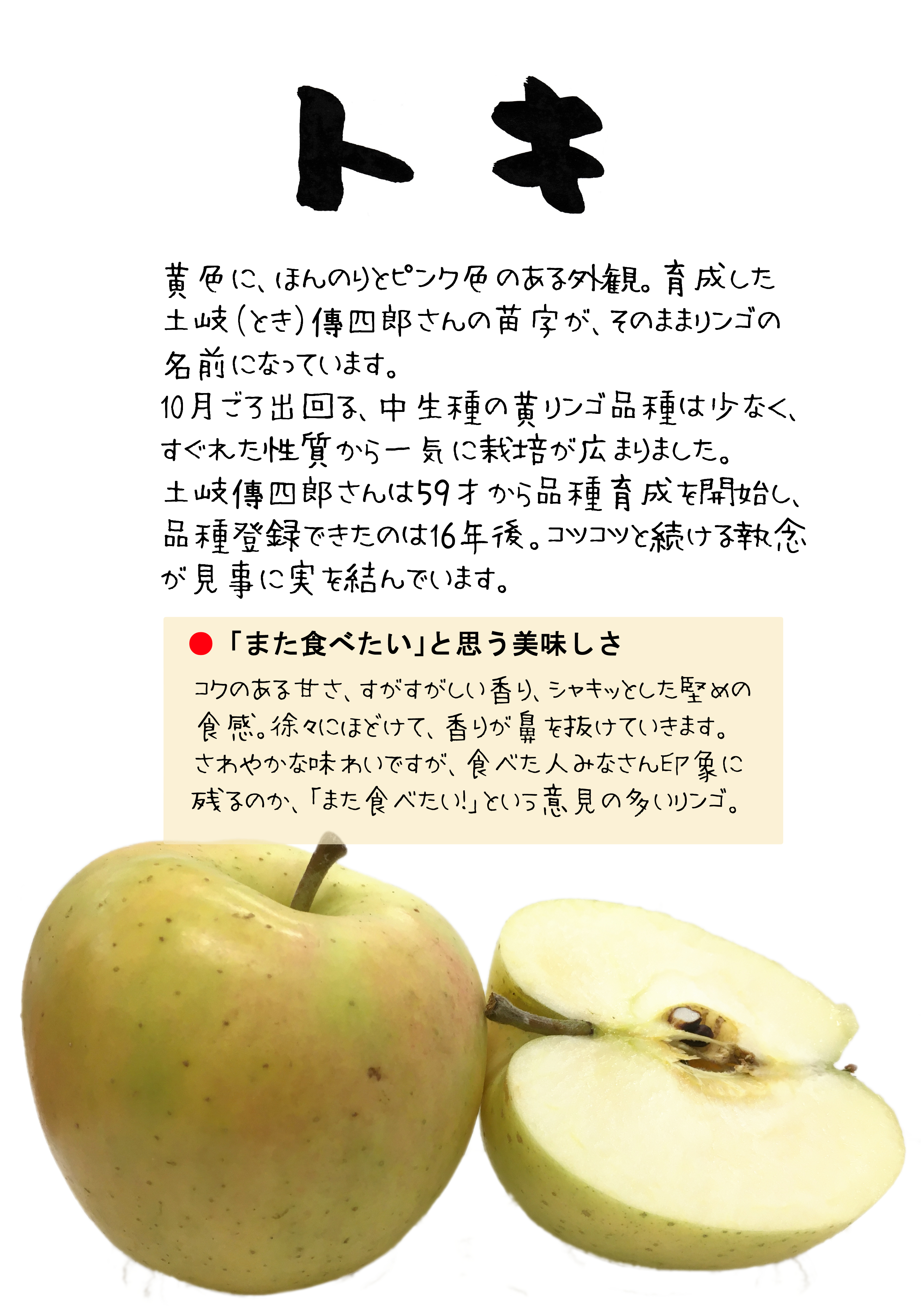 リンゴの名は、土岐(とき)さんの苗字が、そのまま使われています。