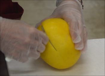 赤道に沿って包丁を入れたら、スプーンを使って、実と皮をはがします。