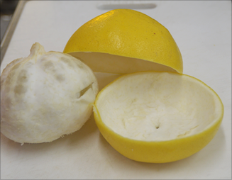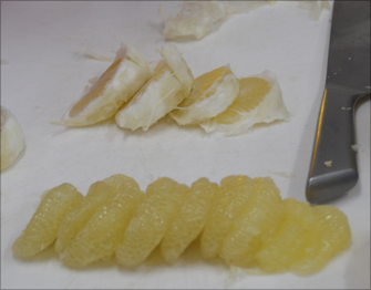剥くときに、皮の油胞から、細かなしぶき(リモネン)が飛び散ります。汚れないよう新聞を敷いておきましょう。
