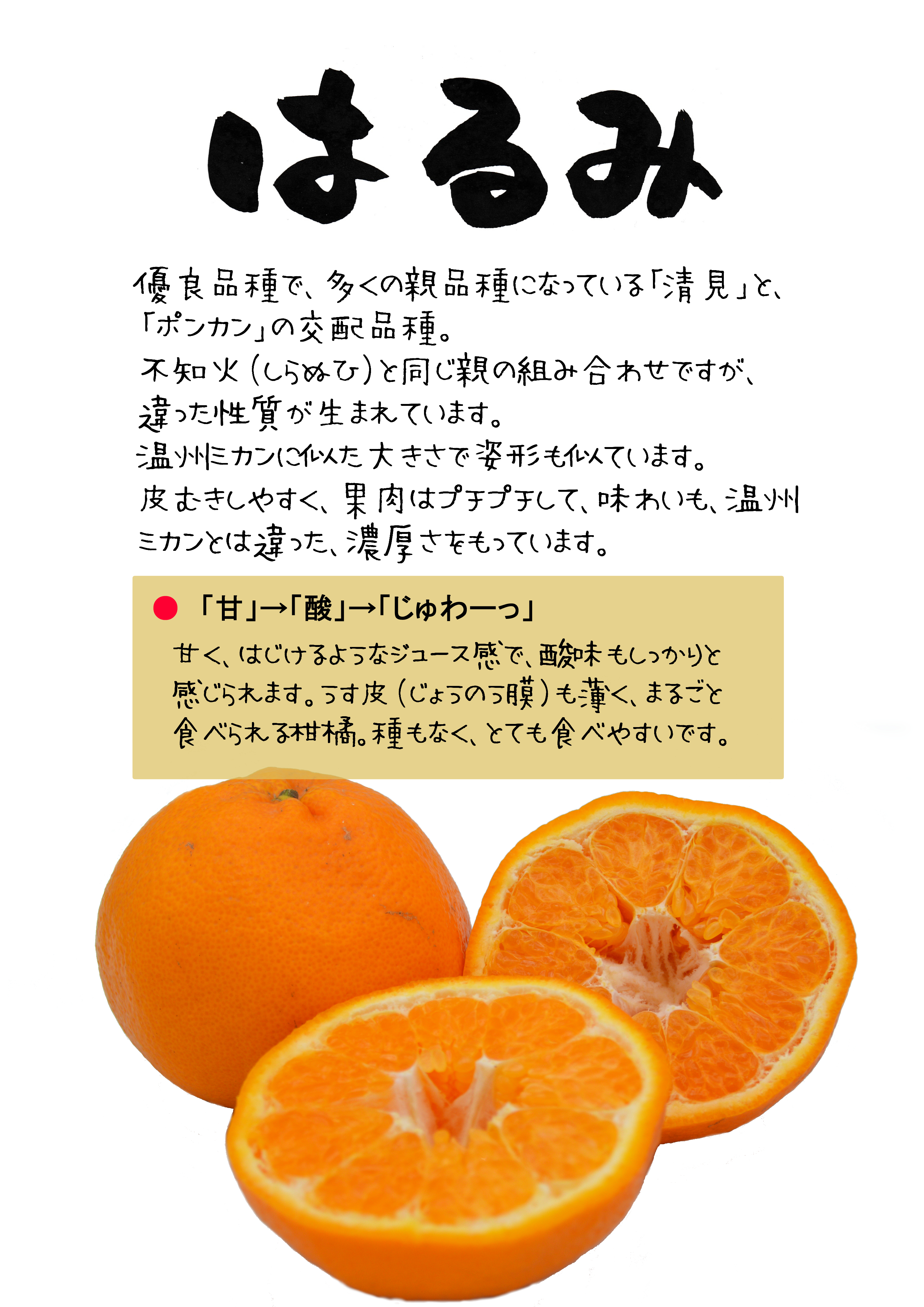 育成名 みかん農林12号。平仮名「はるみ」で品種登録されています。