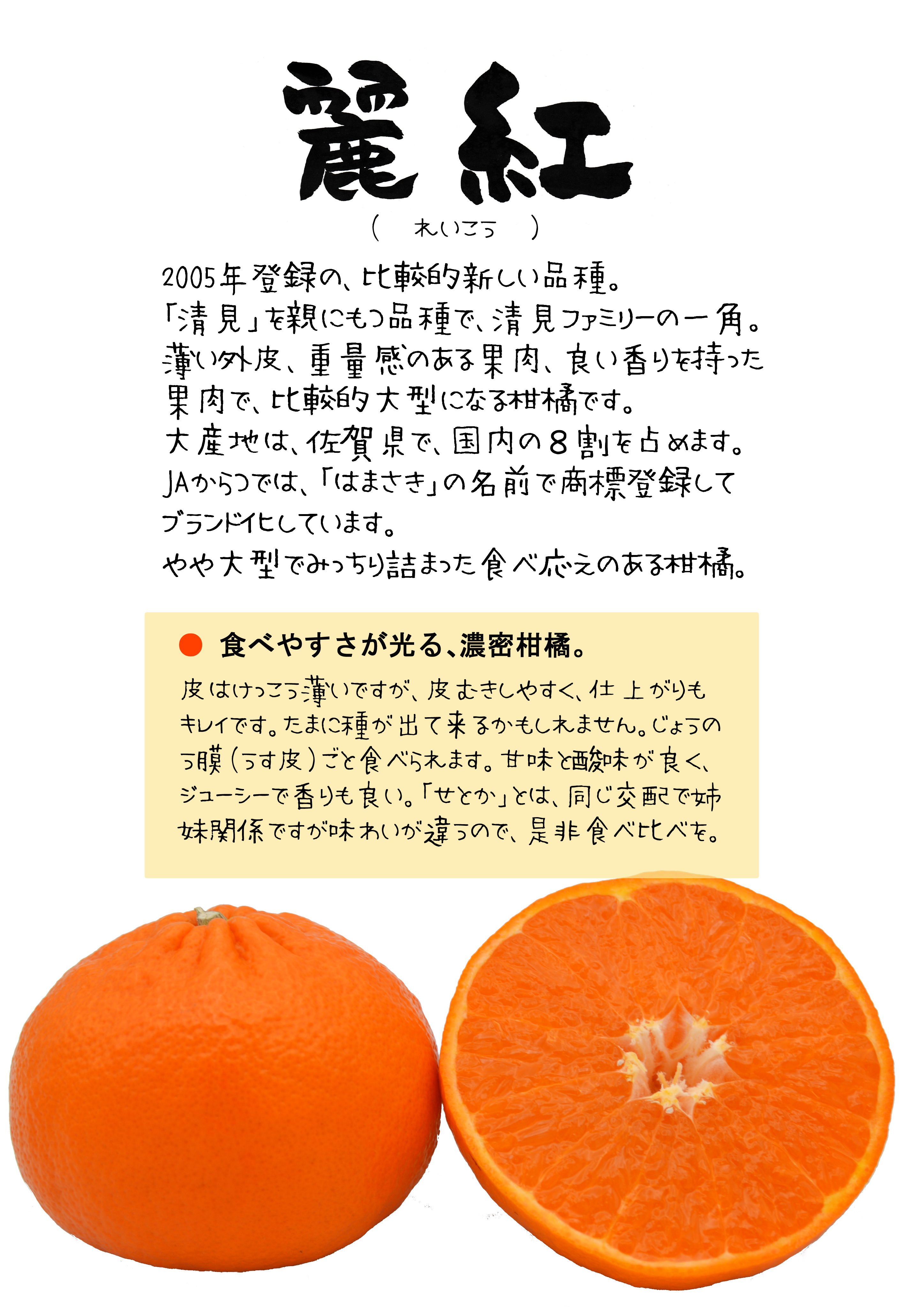 この品種は、(「清見」×「アンコール」)に「マーコット」を交配して育成されたものであり、果形が扁平、果実の重さがやや重、果皮色が赤橙の育成地(長崎県南高来郡口之津町)では1月下旬に成熟するかんきつである。・・・果実の形は扁平、果形指数は大、果頂部の形は陥没、放射条溝及び凹環の有無は無、果梗部の形は切平面、放射条溝の多少は中である。果心の充実度は空、大きさは大、果実の重さはやや重、果皮の色は赤橙、油胞の大きさは小、密度は疎、凹凸は平、果面の粗滑は滑、果皮の厚さは極薄、果皮歩合は極小、剥皮の難易は易である。じょうのう膜の硬さは中、さじょうの形は短、大きさは小、色は濃橙である。果汁の多少は多、甘味は高、酸味は中、香気の多少は多、種子数は少、胚の数は多胚である。発芽期は中、開花期は晩、成熟期は早で育成地においては1月下旬である。隔年結果性は中、浮皮果及び裂果の発生は無、貯蔵性は中である。「せとか」及び「マーコット」と比較して、果心が大きいこと、成熟期が早いこと等で区別性が認められる。