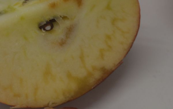 一般的な蜜入りというと、ハチミツ色のような?感じなのですが、このリンゴでは、赤味のさした色合いになるようです。また、種回りの中心部に多く見られるわけではないようです。