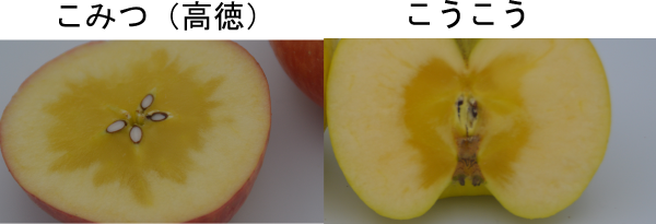 高徳の選抜品「こみつ」、黄りんごで蜜入りしやすい「こうこう」の、それぞれ蜜入りです。
