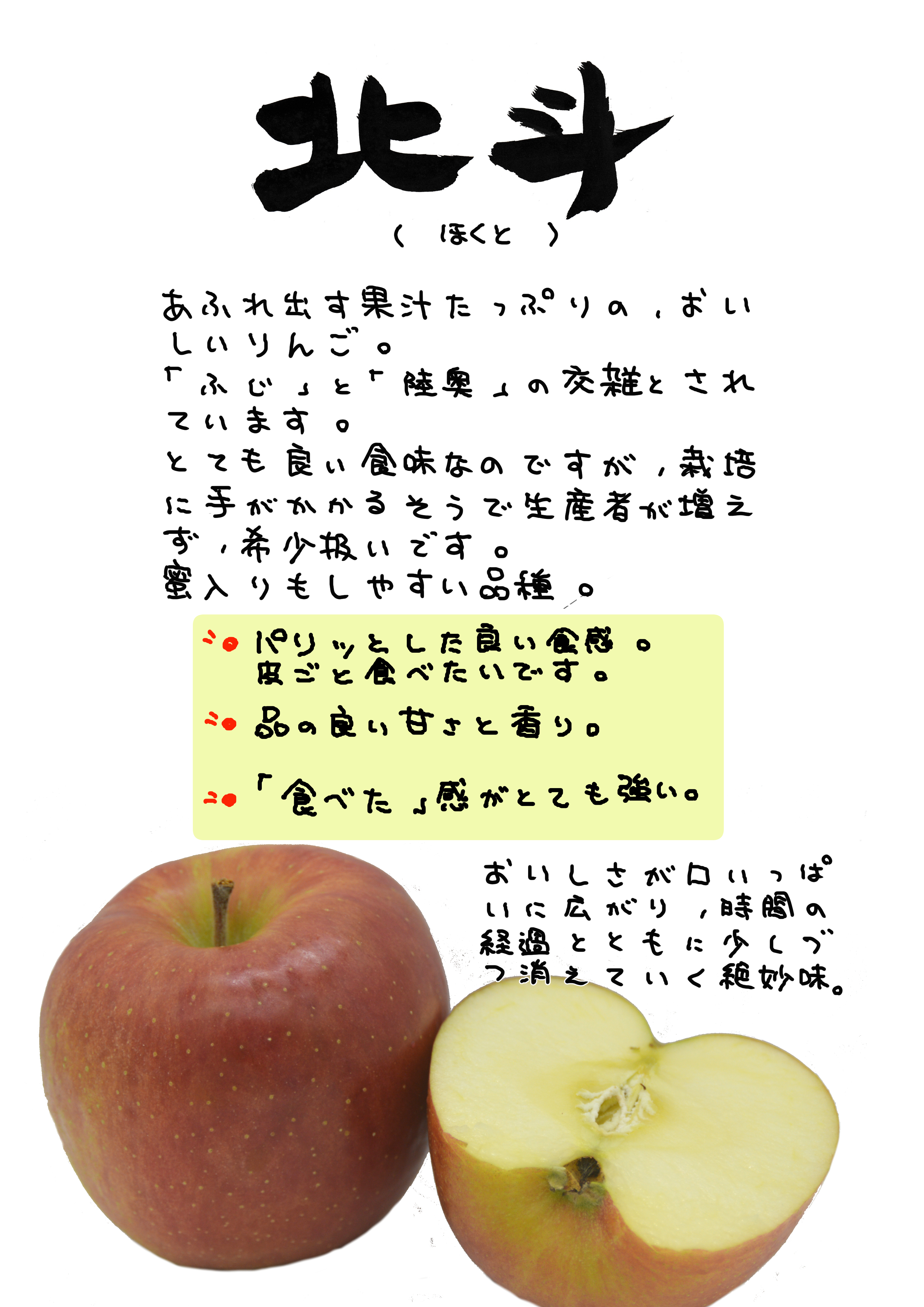 食中の微妙な印象は、このりんごは強く記憶に残ります。こういった感覚は、りんごを食べ比べていると、ずいぶん印象がちがうものです。ザ・りんごです。入手はしにくい方です。