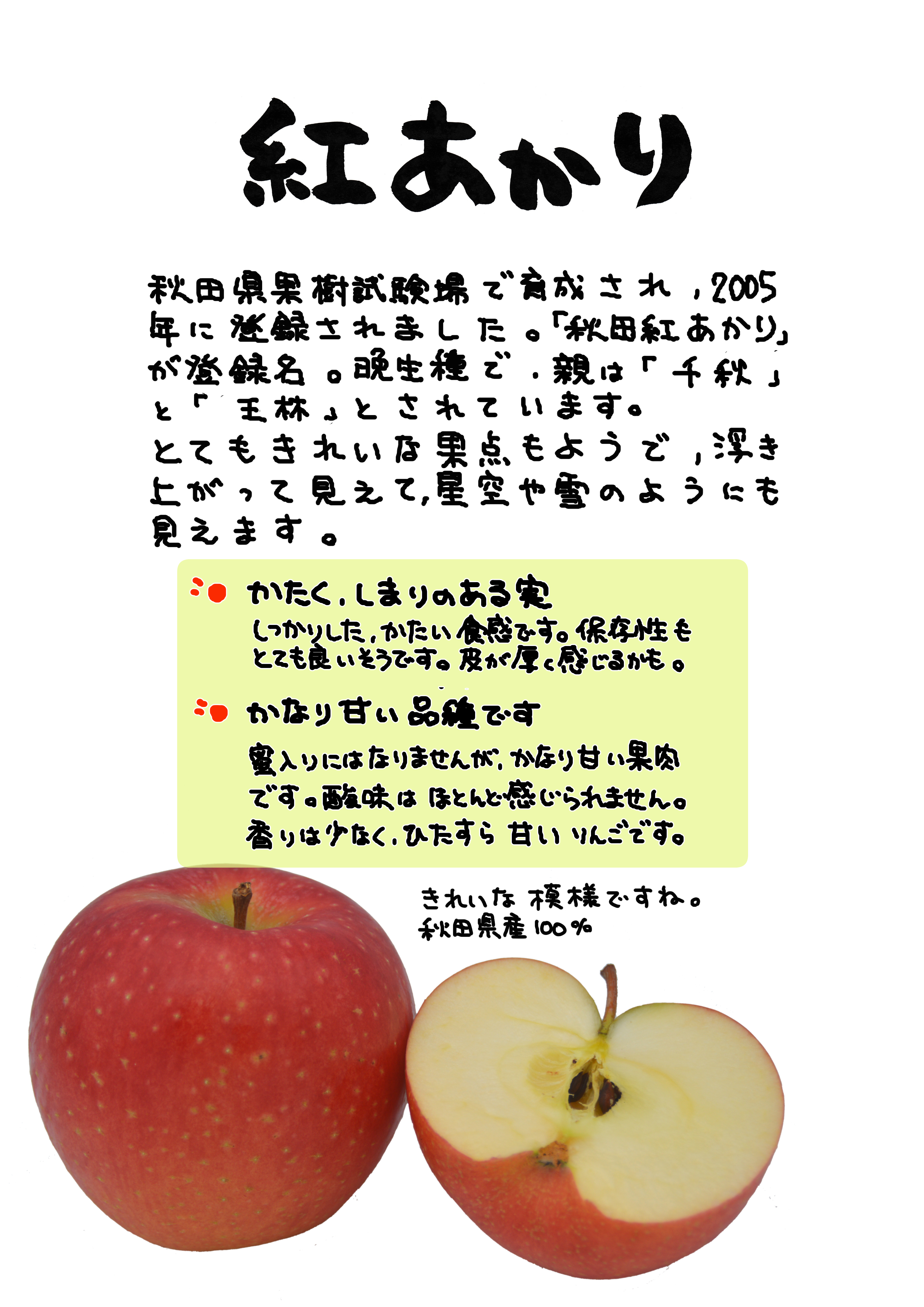 この品種は、自然交雑実生から選抜して育成されたものであり、果形が長円、大きさが大、果皮を被う色が赤の育成地(秋田県平鹿郡平鹿町)では10月下旬に成熟する晩生種である。・・・果肉の色は黄白、褐変化、硬さ及び肉質は中、蜜の多少は無~僅、甘味は高、酸味は弱、渋味、香気及び果汁の多少は中、・・・成熟期は晩で育成地においては10月下旬である。結果の早晩は中、後期落果は無~僅、普通貯蔵及び冷蔵貯蔵は長、心かびの発生は無~僅である。 「ふじ」と比較して、果皮を被う色の強さが濃いこと、果皮のひびが有ること等で区別性が認められる。