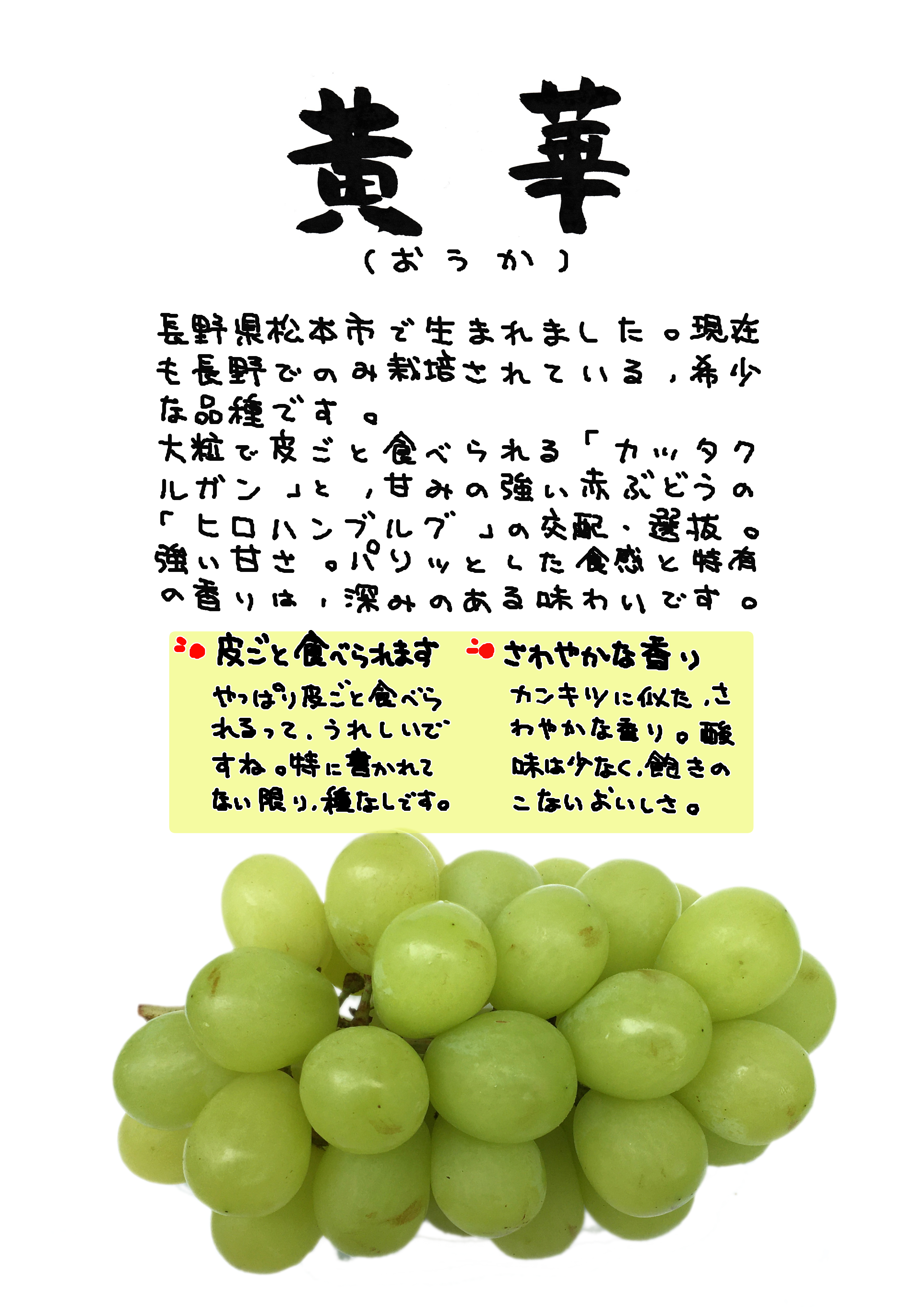 長野県松本市の大村嘉汎氏の交配育成。現在育成者権は切れていますが、県外栽培状況は不明。写真のものも長野県産で市場流通のものを入手。第二のシャインマスカットになるか・・・