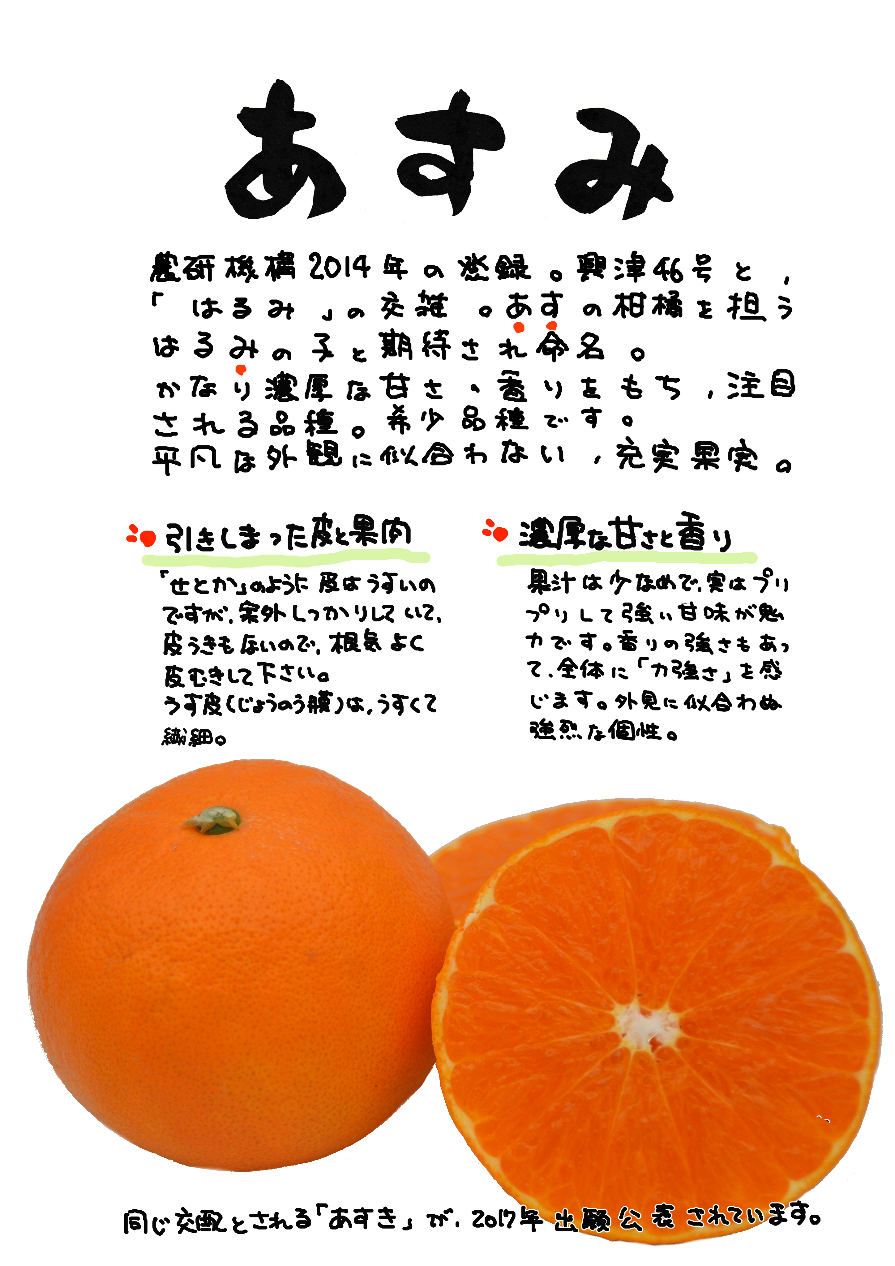 ・・・果実の形は扁球、果頂部の形は平坦、・・・果心の充実度は中、果心の大きさは小、果実の重さはやや重、果皮の色は橙、油胞の大きさは小、油胞の密度は中、油胞の凹凸は平、果面の粗滑は滑、果皮の厚さは極薄、果皮歩合は極小、剥皮の難易は中、じょうのう膜の硬さはやや軟、さじょうの形は中、さじょうの大きさは中、さじょう(果肉)の色は濃橙、果汁の多少は多、甘味は高、酸味は中、香気の多少は中、種子数は少、・・・出願品種「あすみ」は、対照品種「はるみ」と比較して、果頂部の形が平坦であること、果梗部の形が切平面であること、果心の充実度が中であること、果心の大きさが小であること、胚の数が単胚であること等で区別性が認められる。対照品種「せとか」と比較して、花粉の多少が中であること、胚の数が単胚であること等で区別性が認められる。