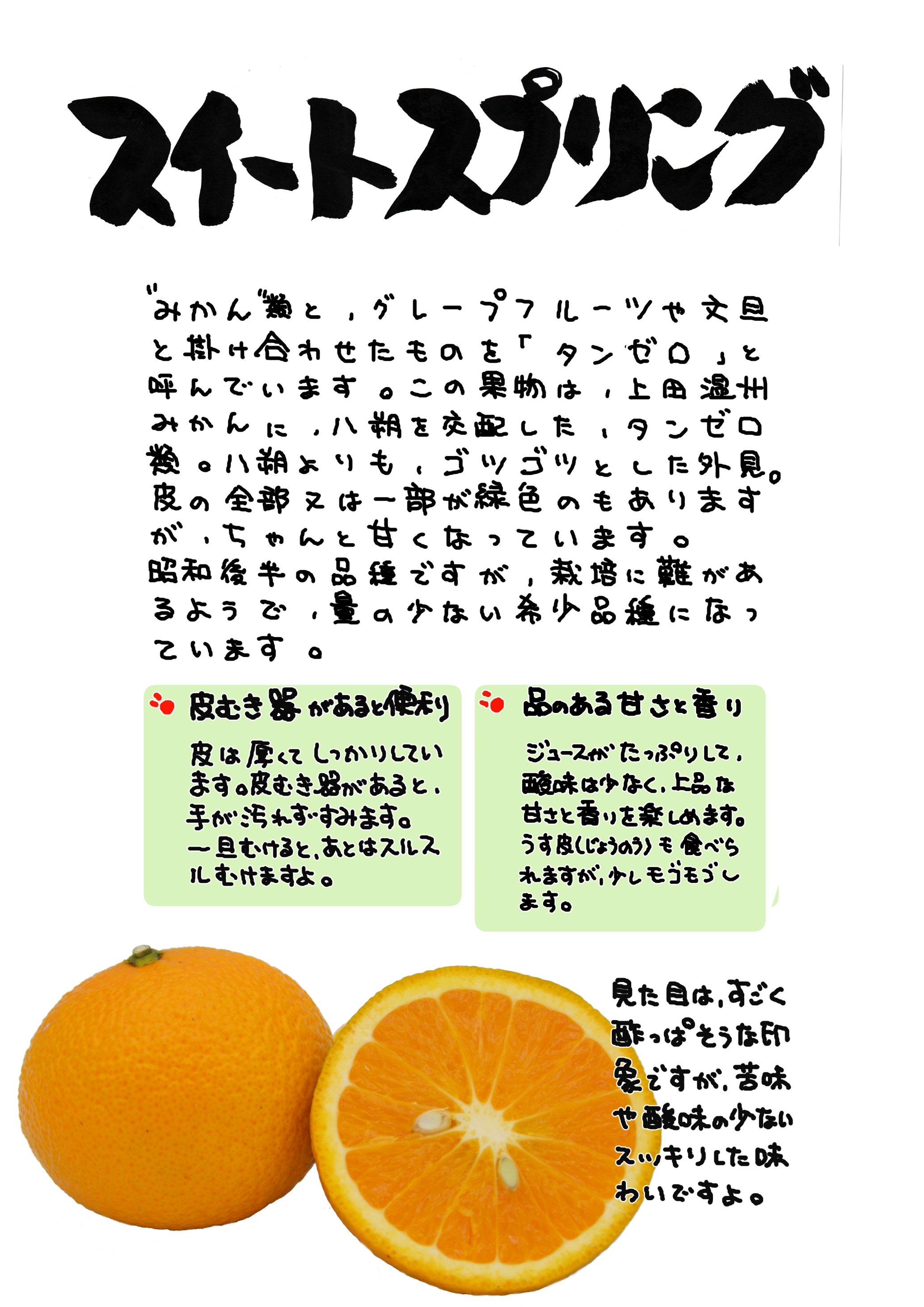 食べてみると、八朔とは別種のもので、文字通り「甘い」「春」を思わせる味わいです。