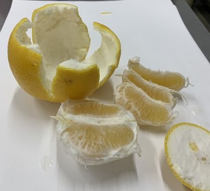 アルベド部分(白いふわふわした部分)もそれなりの厚みがありますが、苦味などは少なく、食べても嫌な感じではないです。