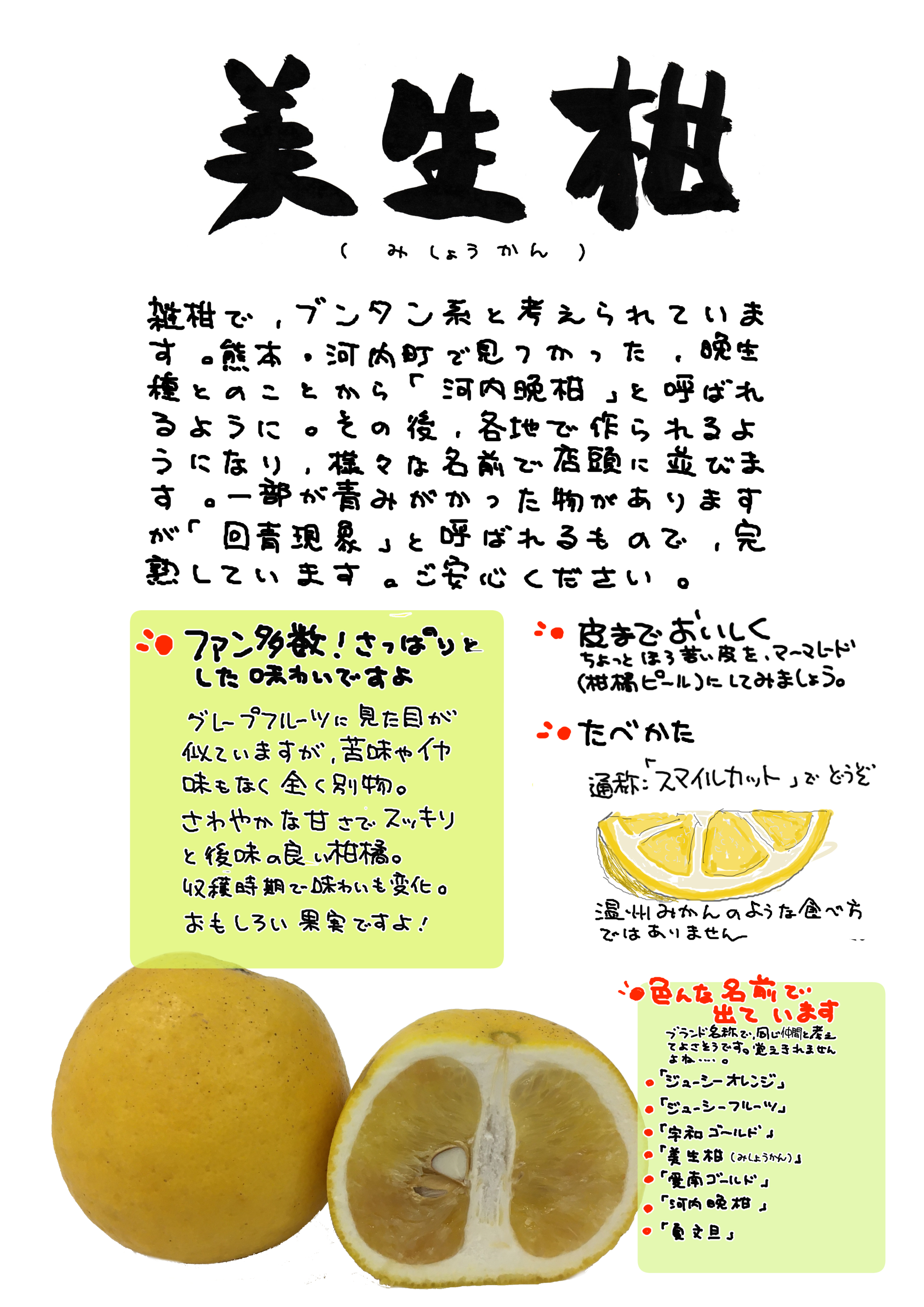 発見地の地名と、晩生の柑橘であることから、「河内晩柑」と呼ばれます。昭和10年のこと。