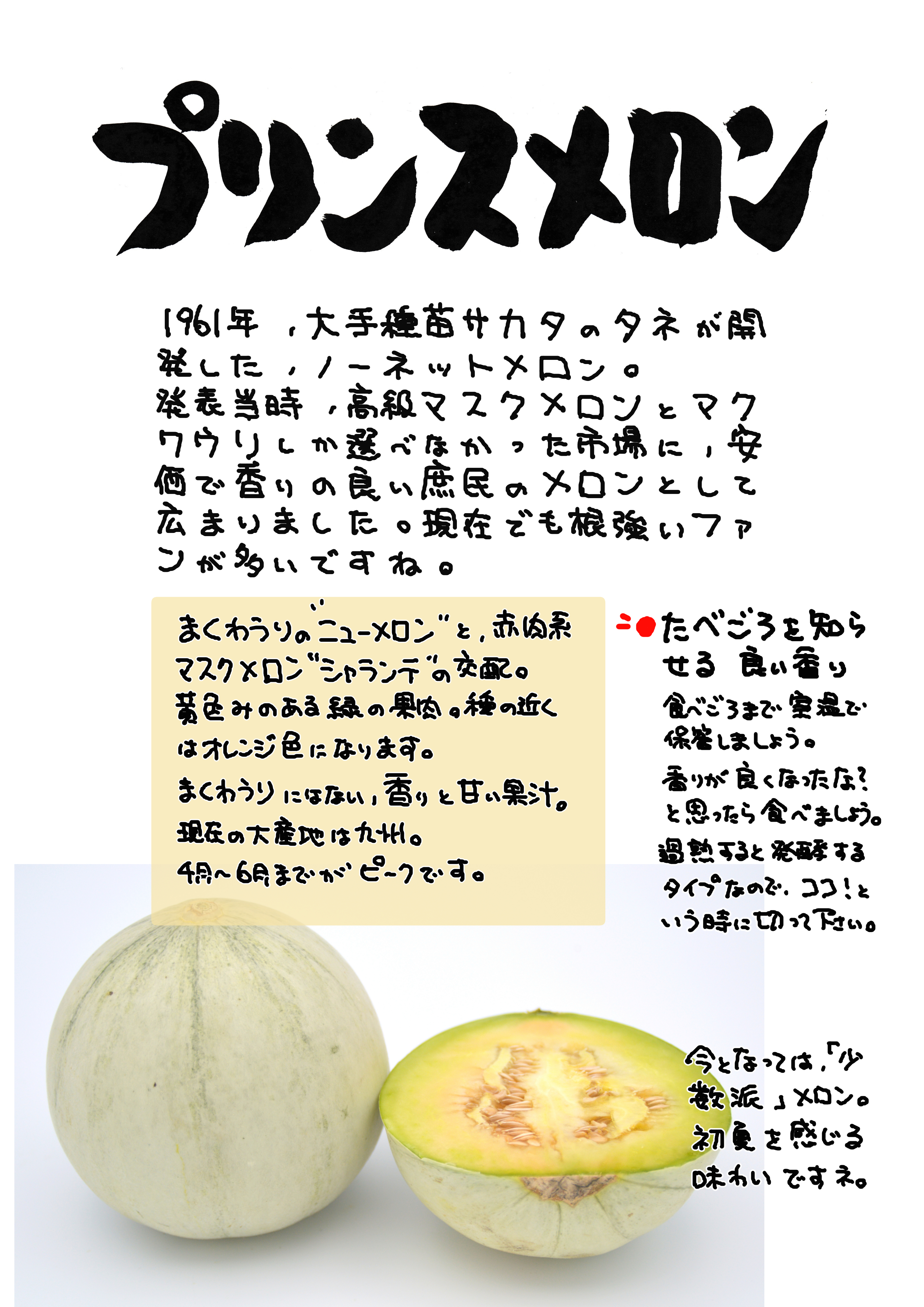 名前の由来は、横浜市場の果実業界関係者の集まり「プリンス会」というのが存在していました。そこで試食会をやって好評だったのが縁で、「プリンスメロン」と名付けたそうです。