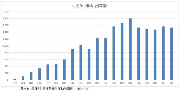 令和2年の大産地は、愛媛765t 広島638t 長崎143tとなっています。