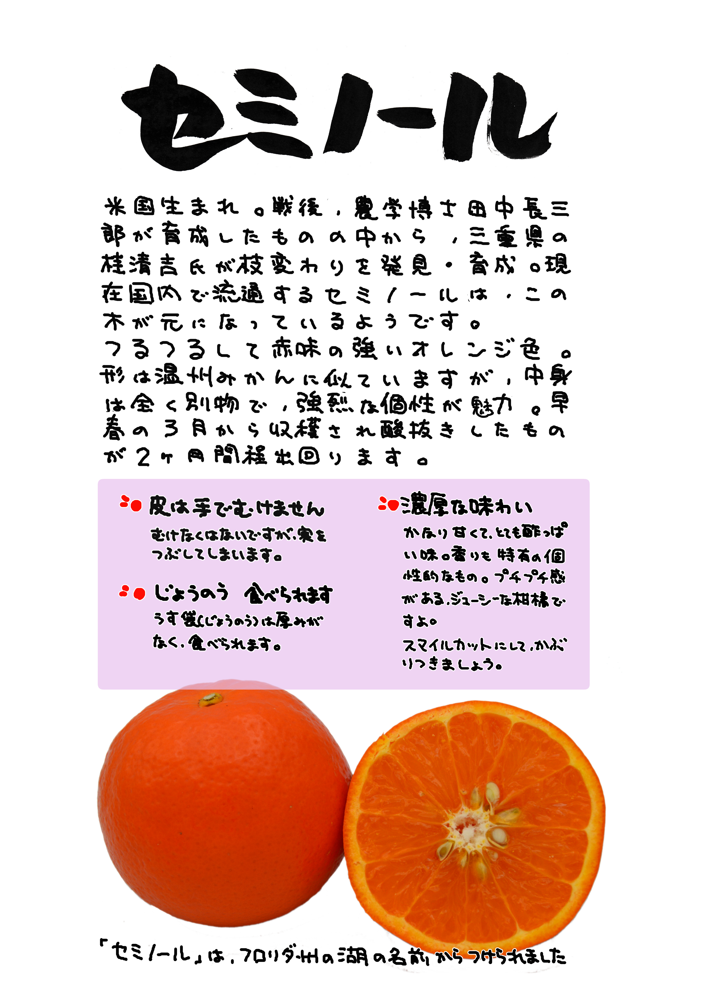 「セミノール」のほか、同時に導入された「カラマンダリン」も同様に田中長三郎氏・桂清吉氏のペアで育成されたものです。