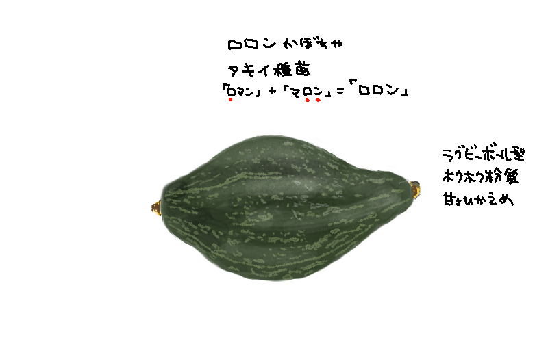 『ロロン』というお菓子のようなかわいらしい名前には、もっとみなさんにカボチャを食べてもらいたいという育成者の「ロマン」と、まるで食味が「マロン」のような甘さとおいしさを持つことが由来となっており、『ロロン』のおいしさをたくさんの人に伝えたいという熱い思いが込められています。直売所や家庭菜園などでおいしいカボチャを作りたいという方々に推進していくとともに、食味のよさと形のユニ-クさを活かし、幅広いアプロ-チを進めていきます。