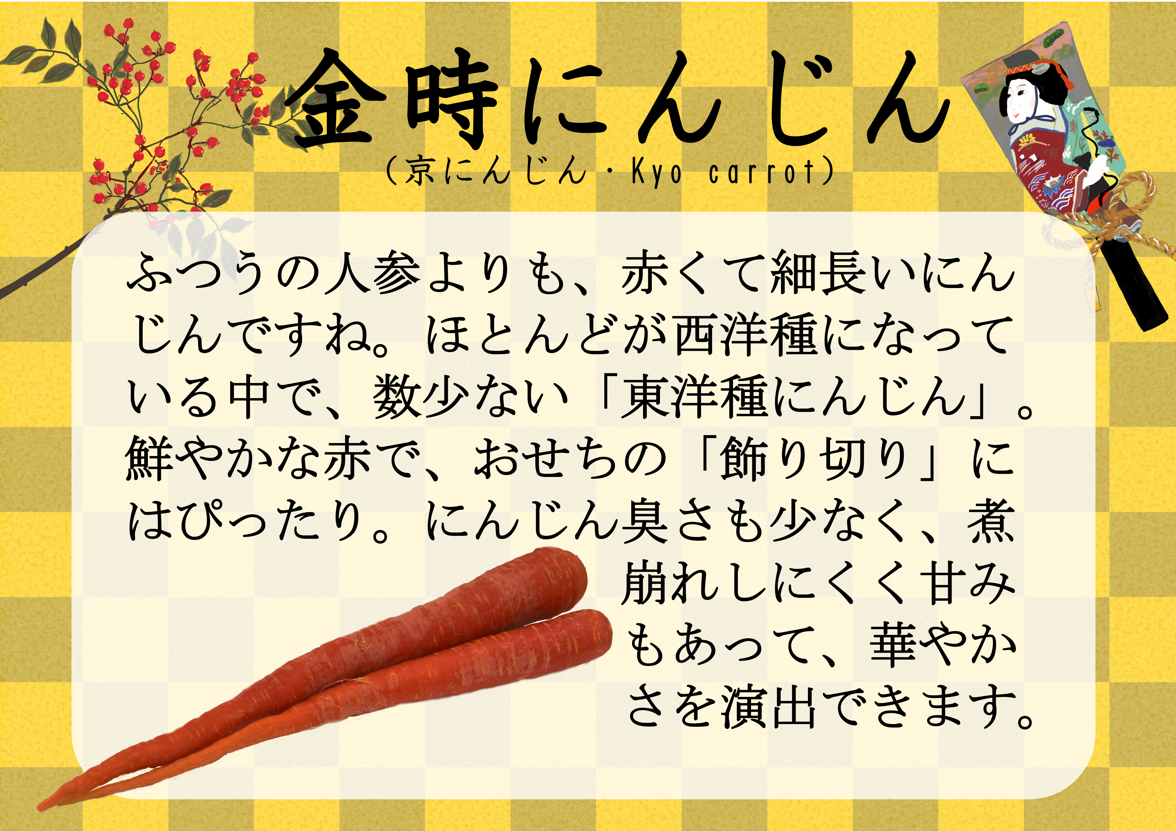 日本の伝統や食文化が出ますね。「おせち」で検索ください。この時期ならではの人参