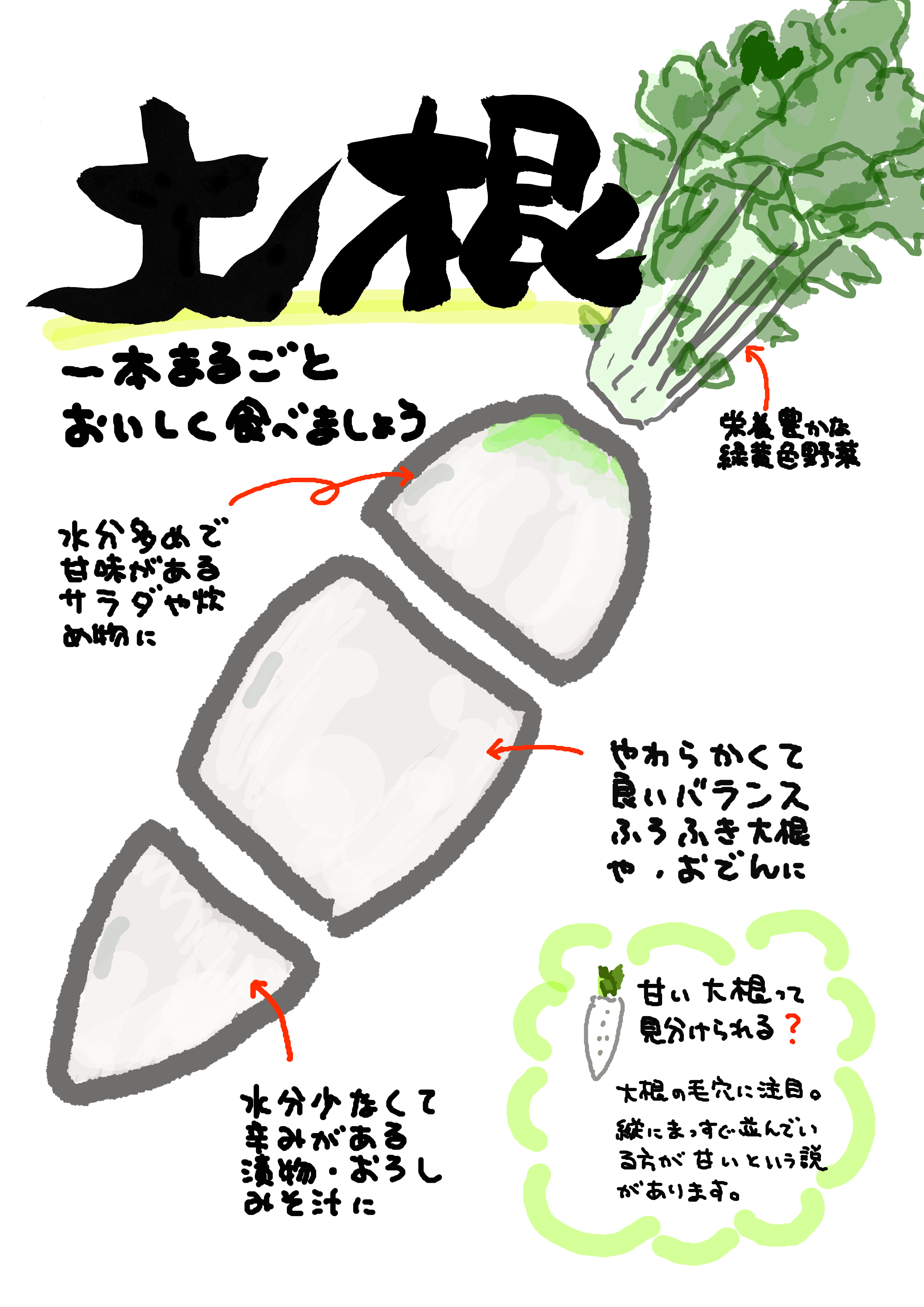 一般的なだいこんとして説明しています。実際には、何の料理に使ってもいいとは思うのですが。コーナー表示POPポップ