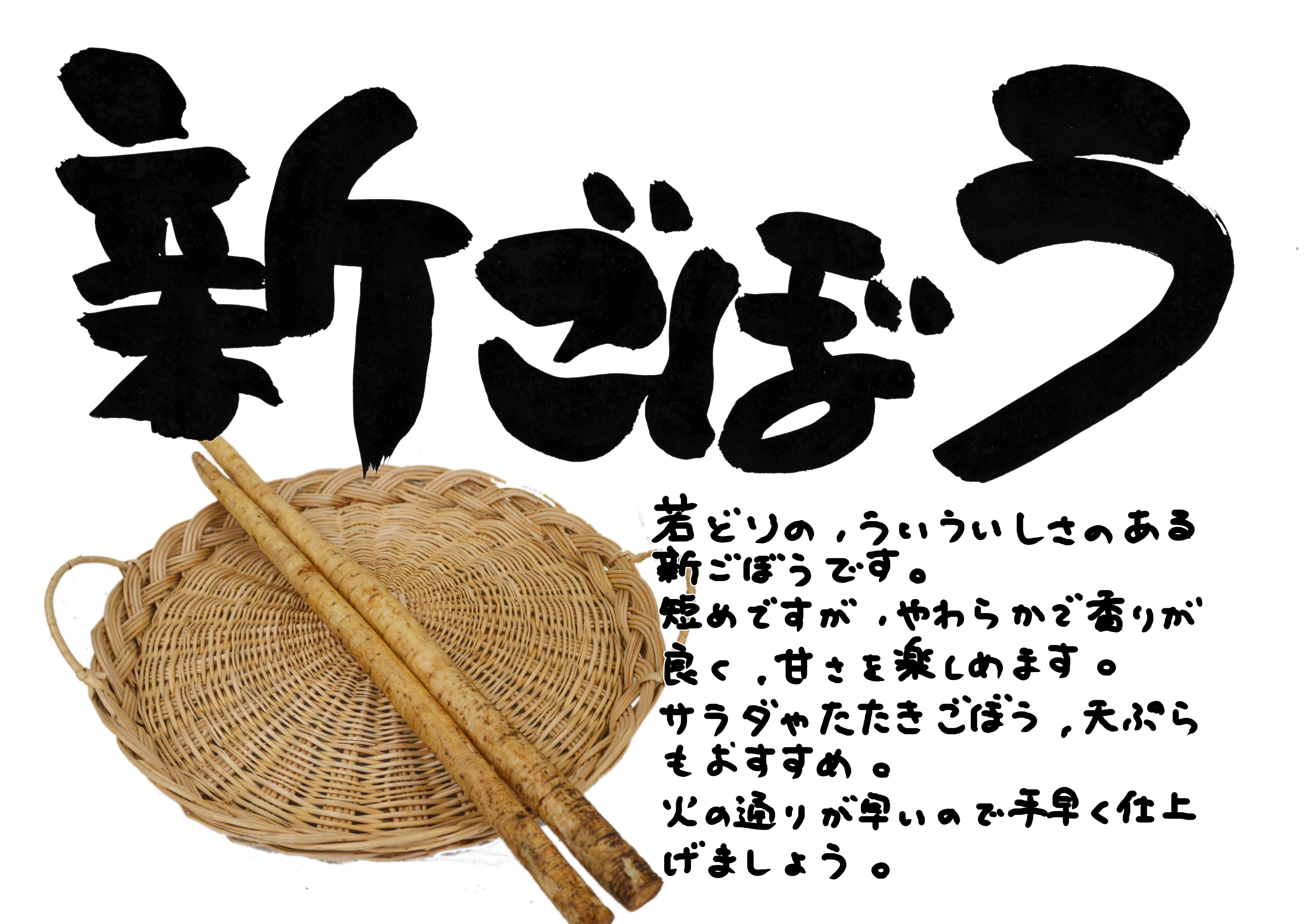 店頭では、もっとラフな感じで楽しく描いています。ダンボールに描くのは楽しいですね。いらない部分は消して自分で手描きしてみてください。ごぼう画像2種類あります。コーナー表示POPポップ