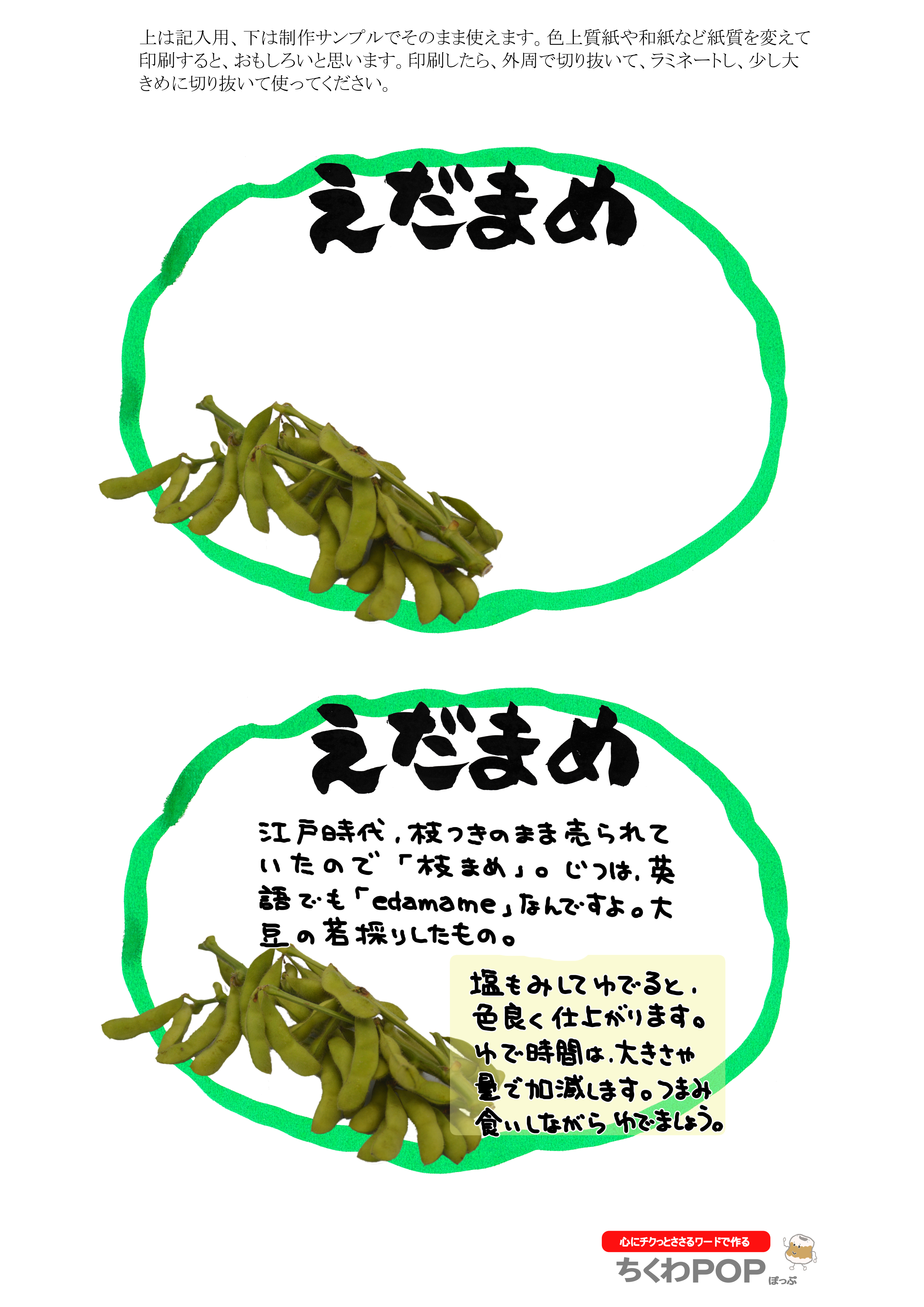 「今日のお豆」で検索してください。1枚にまとめて描き切ってしまうと、時期ずれしたとき商品がなくて困ります。目的は「自作応援」です。さっそく自分でかいてみてください。商品説明は、品種名で別のポップを検索すると出てきますので参考にしてください。