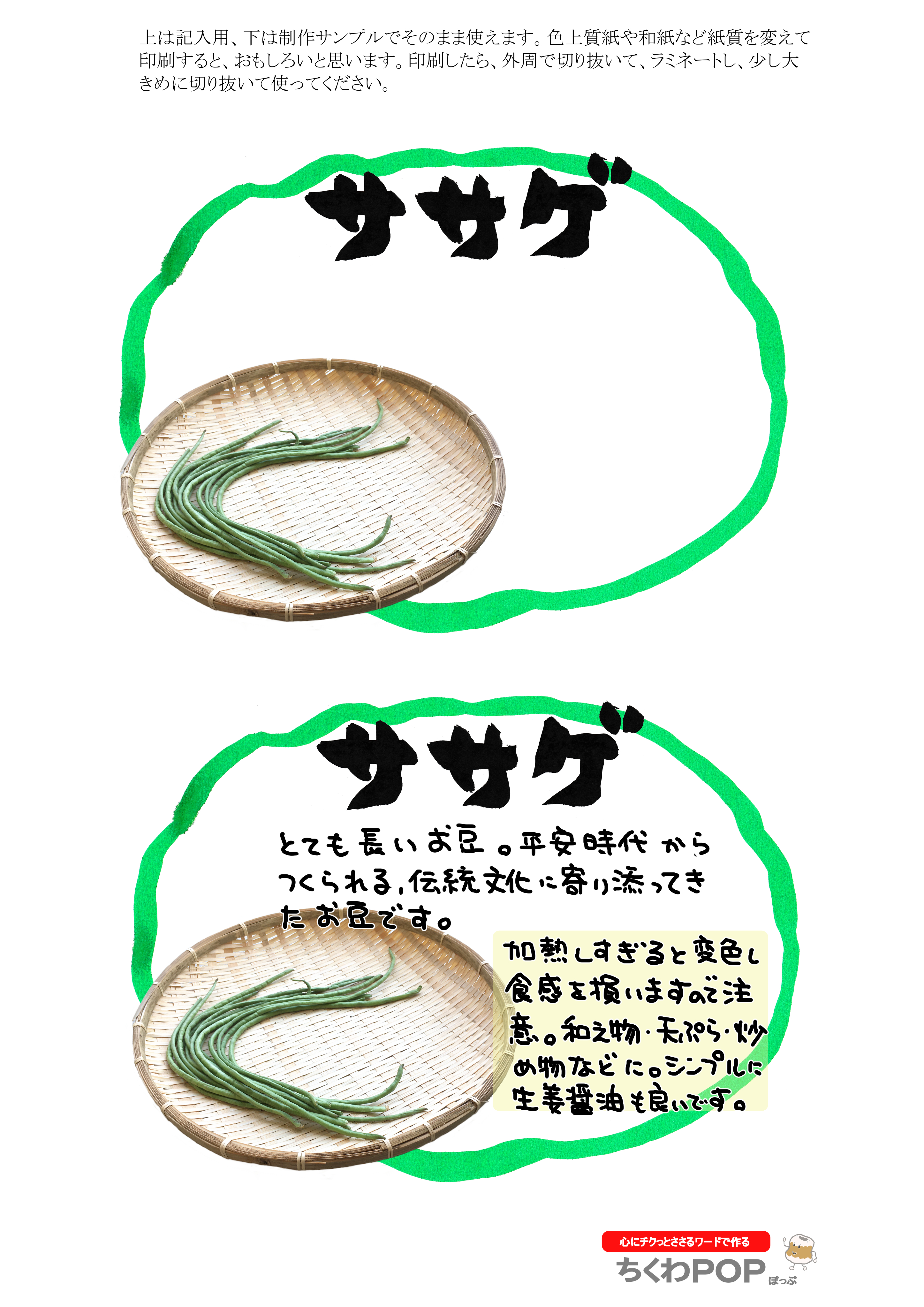 「今日のお豆」で検索してください。1枚にまとめて描き切ってしまうと、時期ずれしたとき商品がなくて困ります。目的は「自作応援」です。さっそく自分でかいてみてください。商品説明は、品種名で別のポップを検索すると出てきますので参考にしてください。