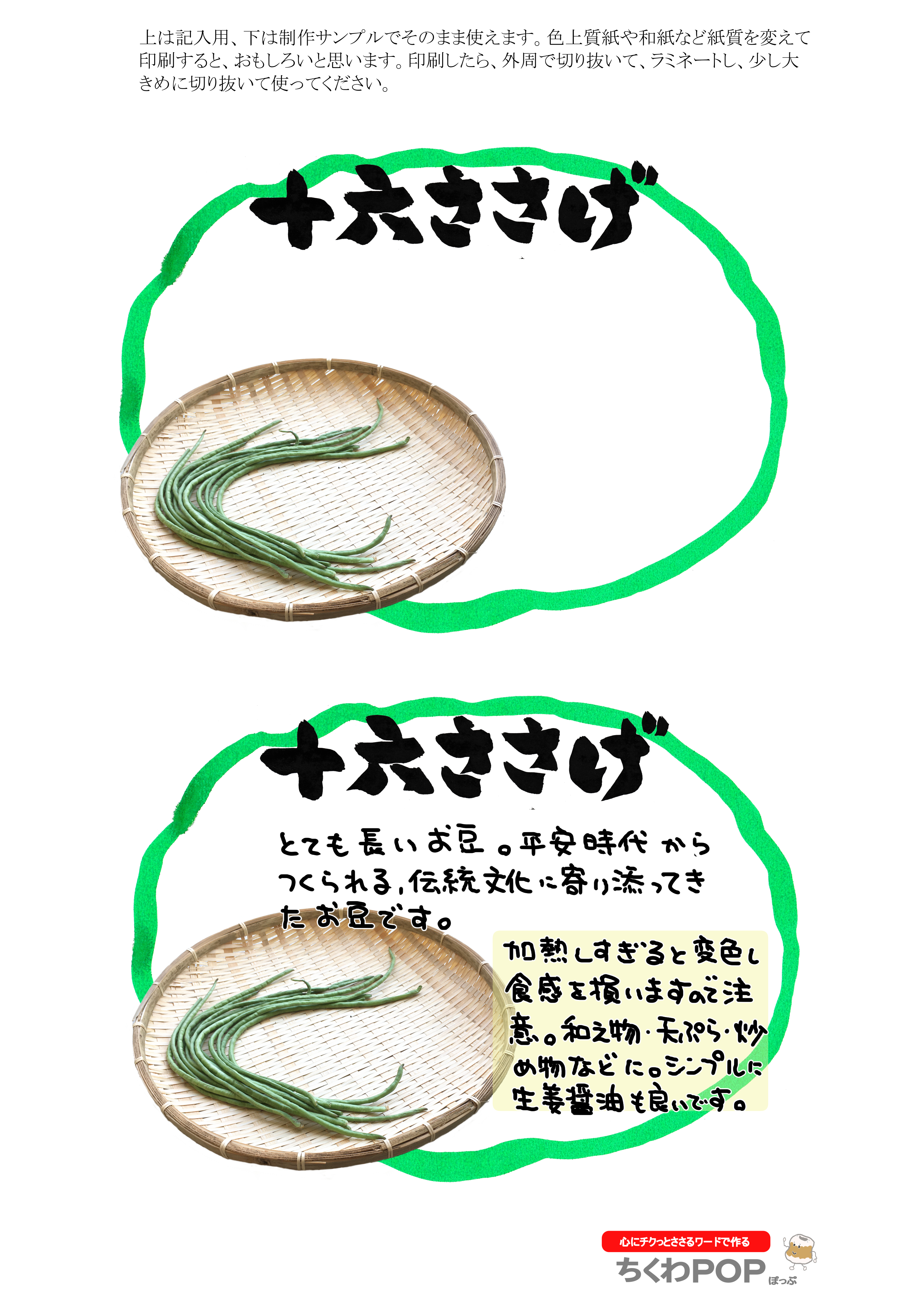 「今日のお豆」で検索してください。1枚にまとめて描き切ってしまうと、時期ずれしたとき商品がなくて困ります。目的は「自作応援」です。さっそく自分でかいてみてください。商品説明は、品種名で別のポップを検索すると出てきますので参考にしてください。