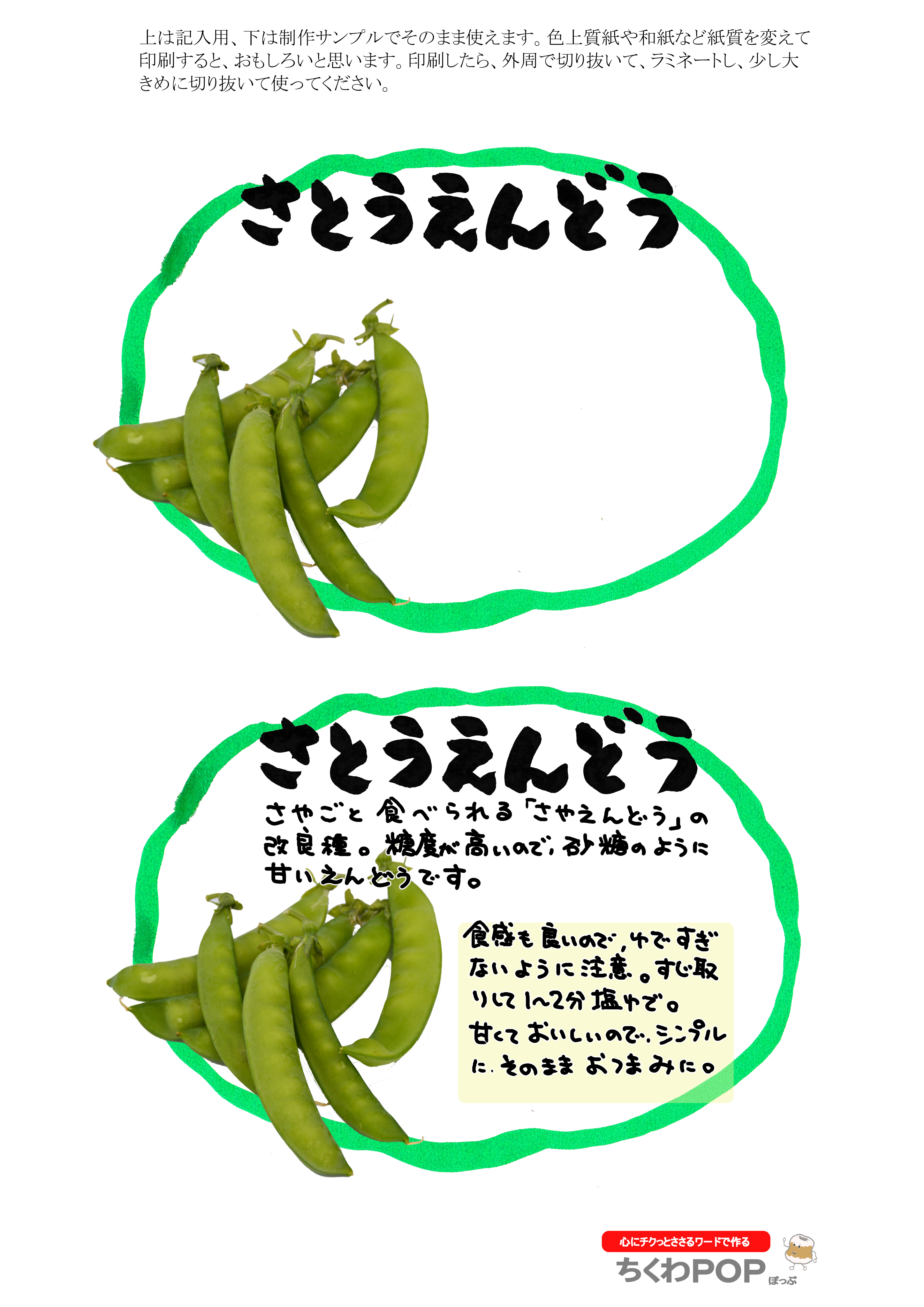 「今日のお豆」で検索してください。1枚にまとめて描き切ってしまうと、時期ずれしたとき商品がなくて困ります。目的は「自作応援」です。さっそく自分でかいてみてください。商品説明は、品種名で別のポップを検索すると出てきますので参考にしてください。