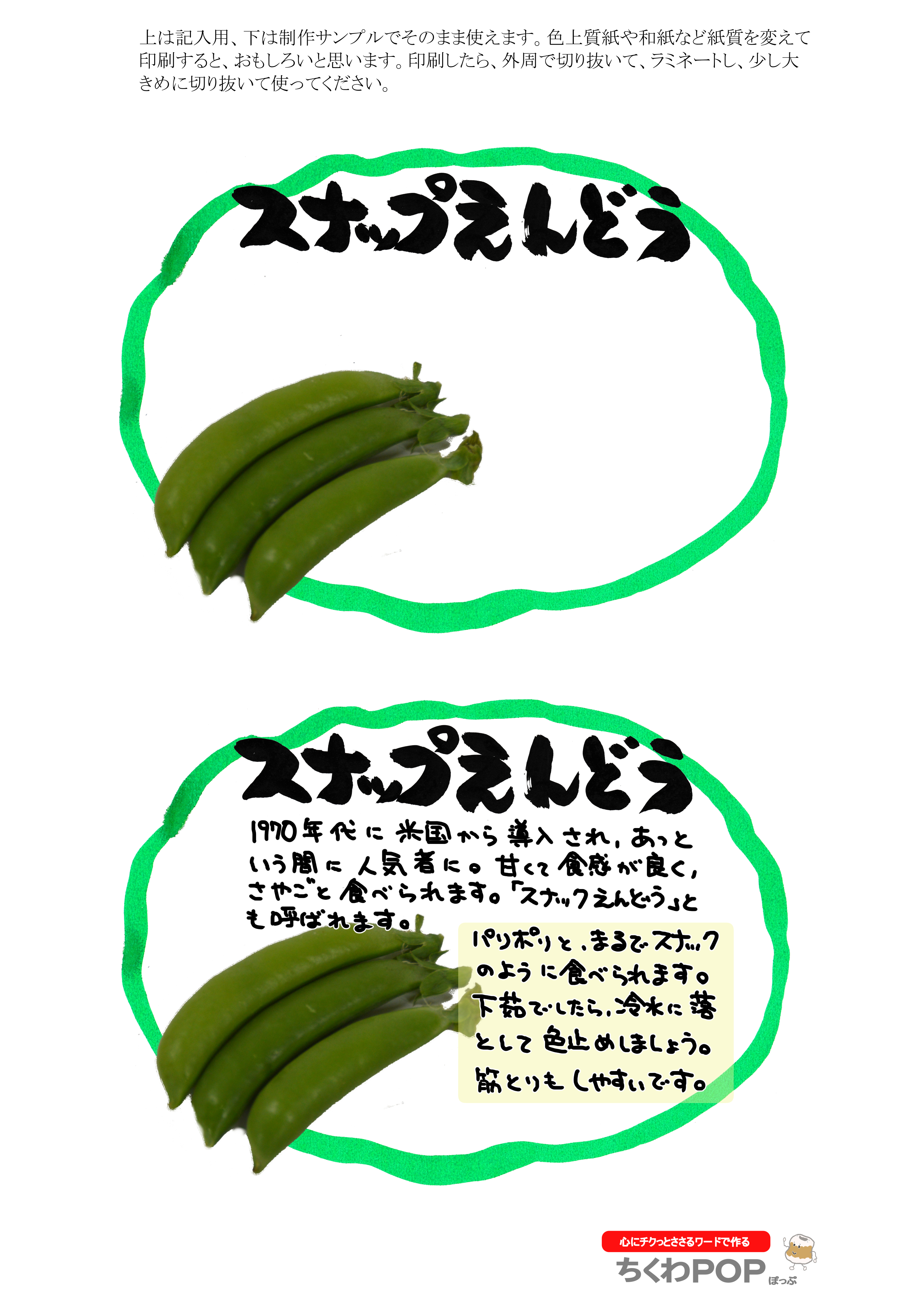 「今日のお豆」で検索してください。1枚にまとめて描き切ってしまうと、時期ずれしたとき商品がなくて困ります。目的は「自作応援」です。さっそく自分でかいてみてください。商品説明は、品種名で別のポップを検索すると出てきますので参考にしてください。