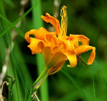 華やかさを感じさせる、ユリに似た形のオレンジの花のヤブカンゾウ。