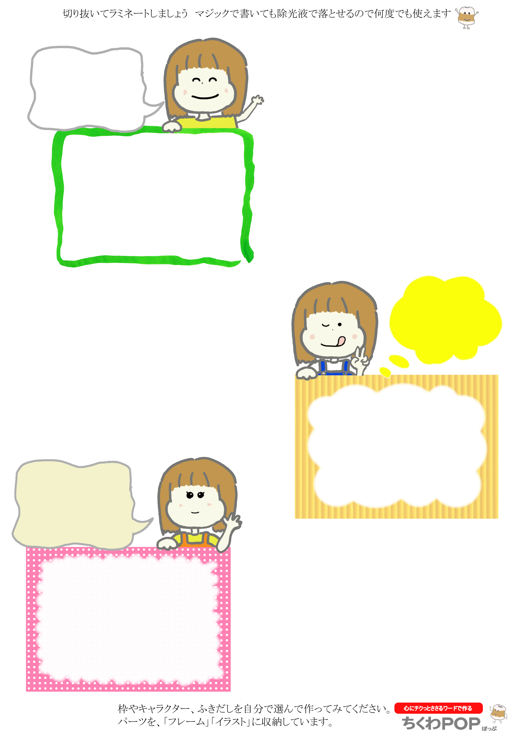 女の子のイラストと枠。A4印刷を想定しています。あまり小さくても大きくてもいけないので、使いやすい大きさにしています。他の画像と合成しやすいpngにしました。