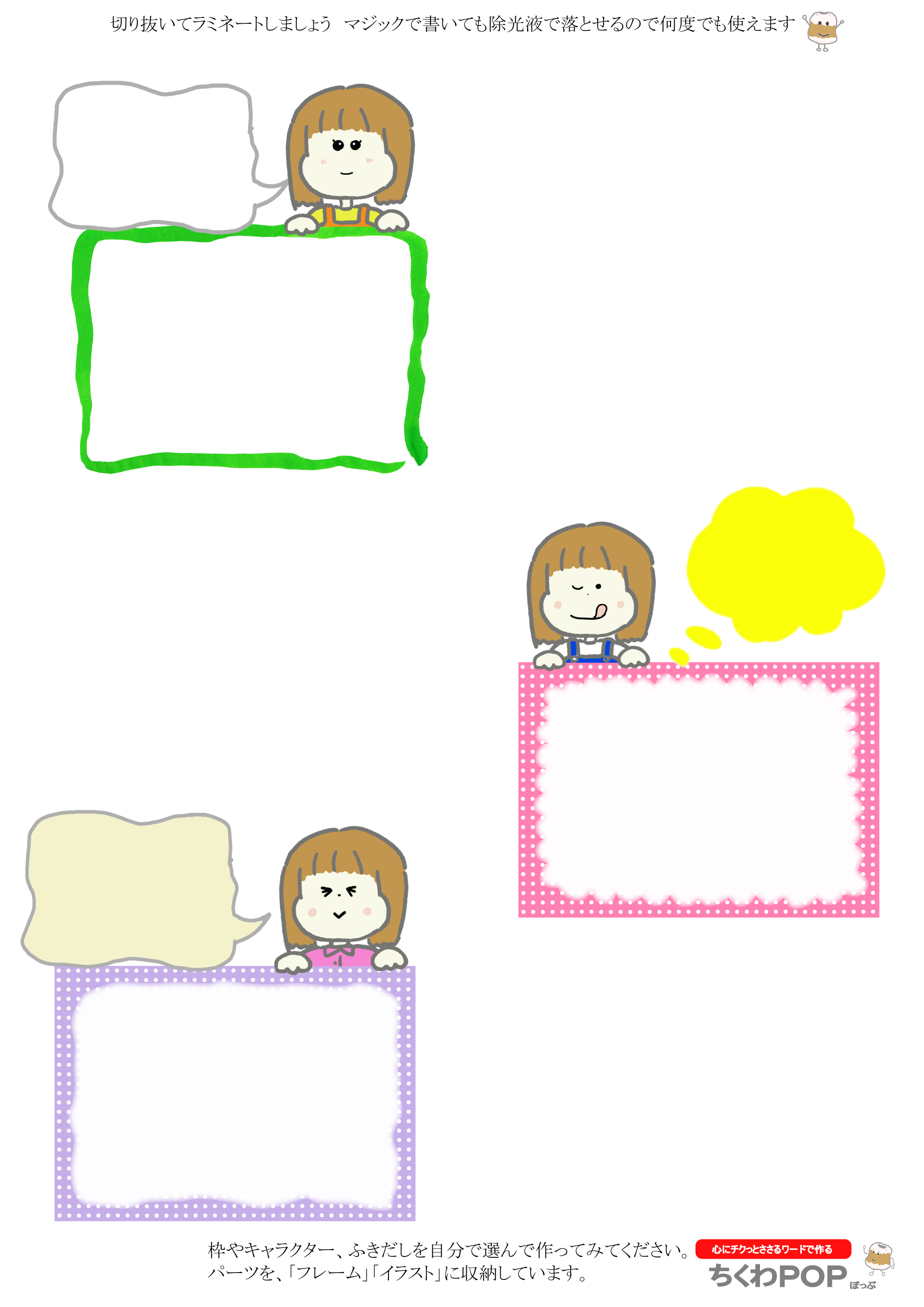 女の子のイラストと枠。A4印刷を想定しています。あまり小さくても大きくてもいけないので、使いやすい大きさにしています。他の画像と合成しやすいpngにしました。