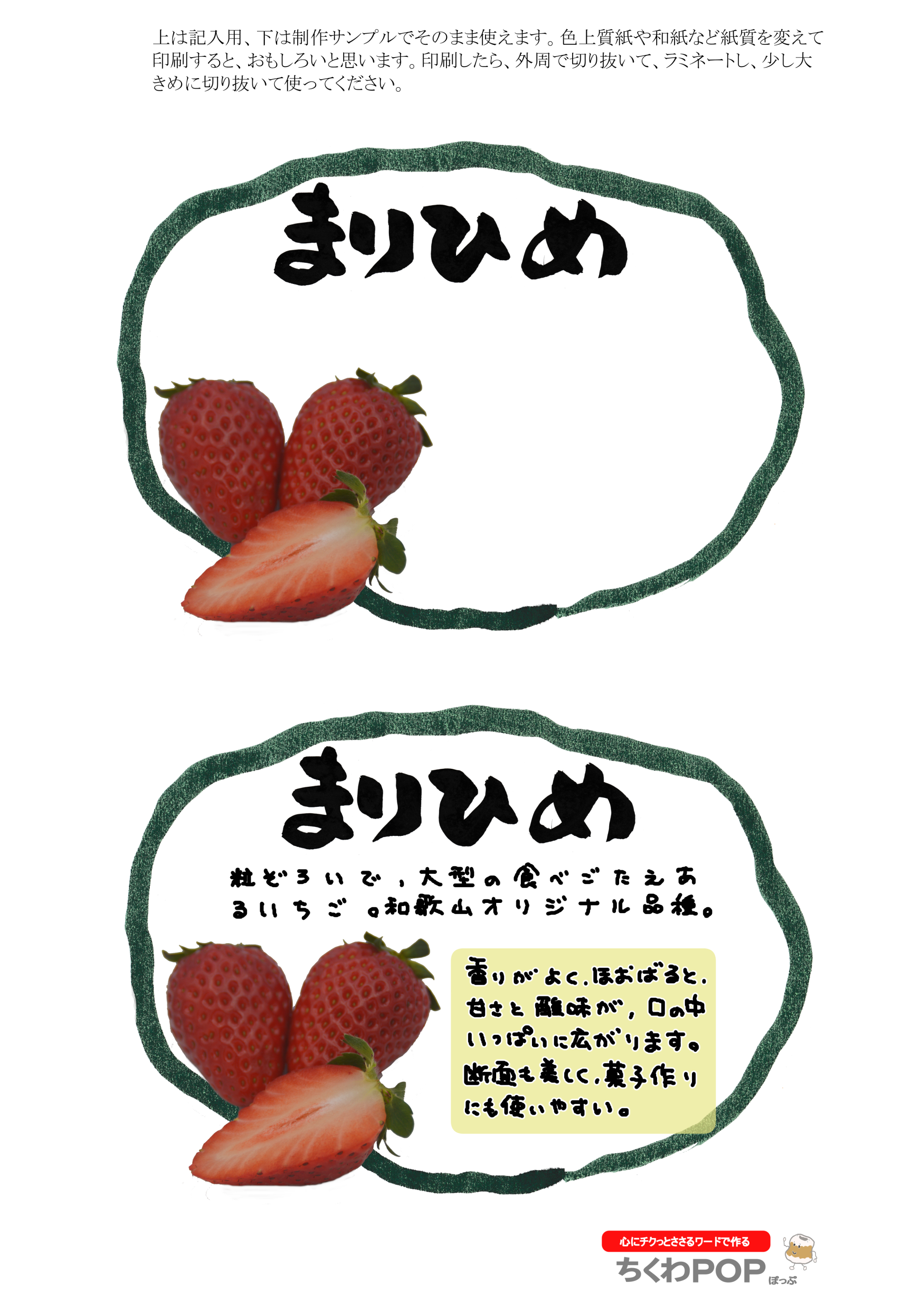 季節や日によって入れ替わる品種を掲示できないかと考え制作しました。自作も目的にしていますので、オリジナルの掲示を作って下さい。ブラックボードやコルクボードなどに配置してみましょう。大型になりやすく、たべごたえのあるいちご。