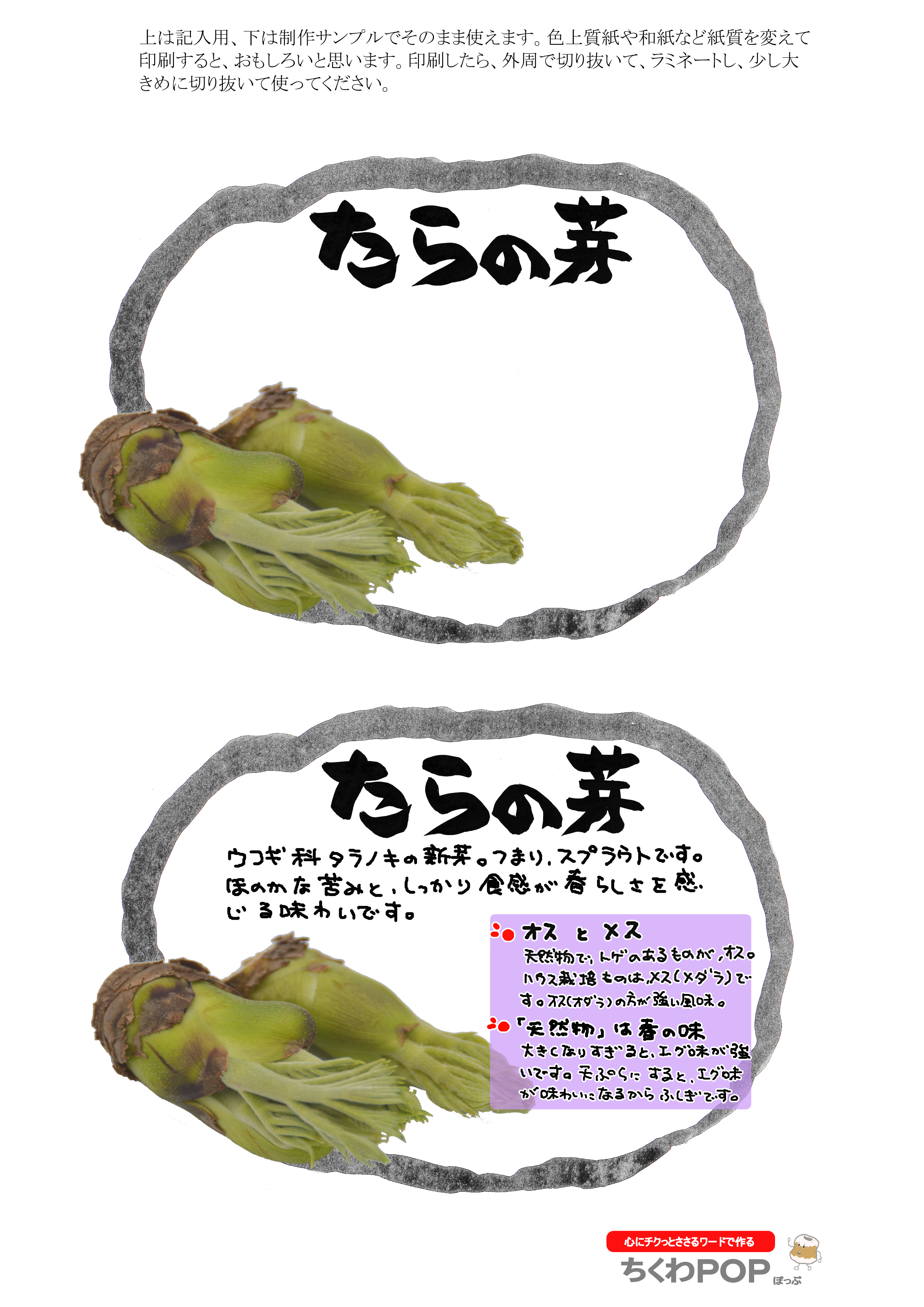 山菜シリーズの差し替えポップです。自作しましょう。ブラックボードやコルクボードなどに配置してみましょう。