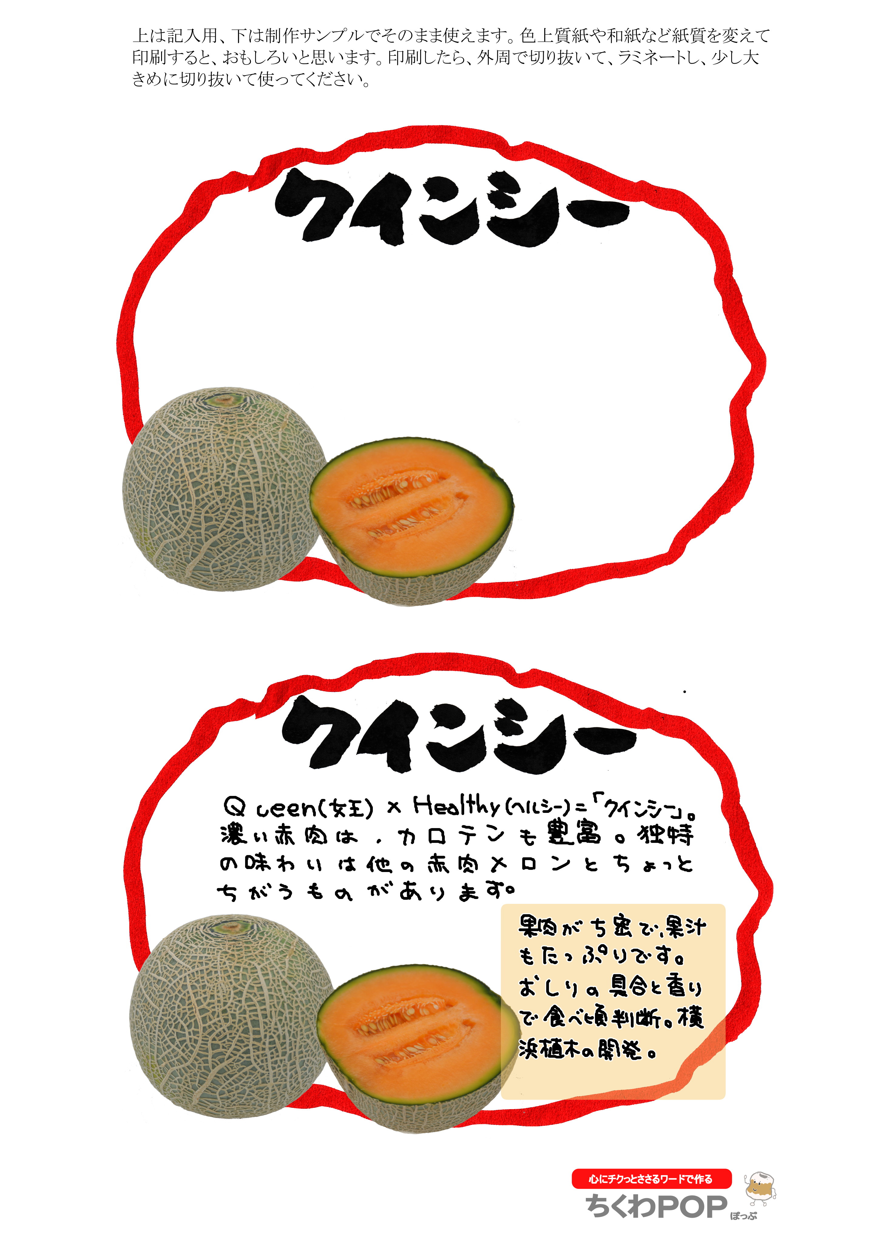 「今日のメロン」で検索してください。1枚にまとめて描き切ってしまうと、現物がない場合、あとあと困ることになりますよね。これなら簡単に差し替えができます。
