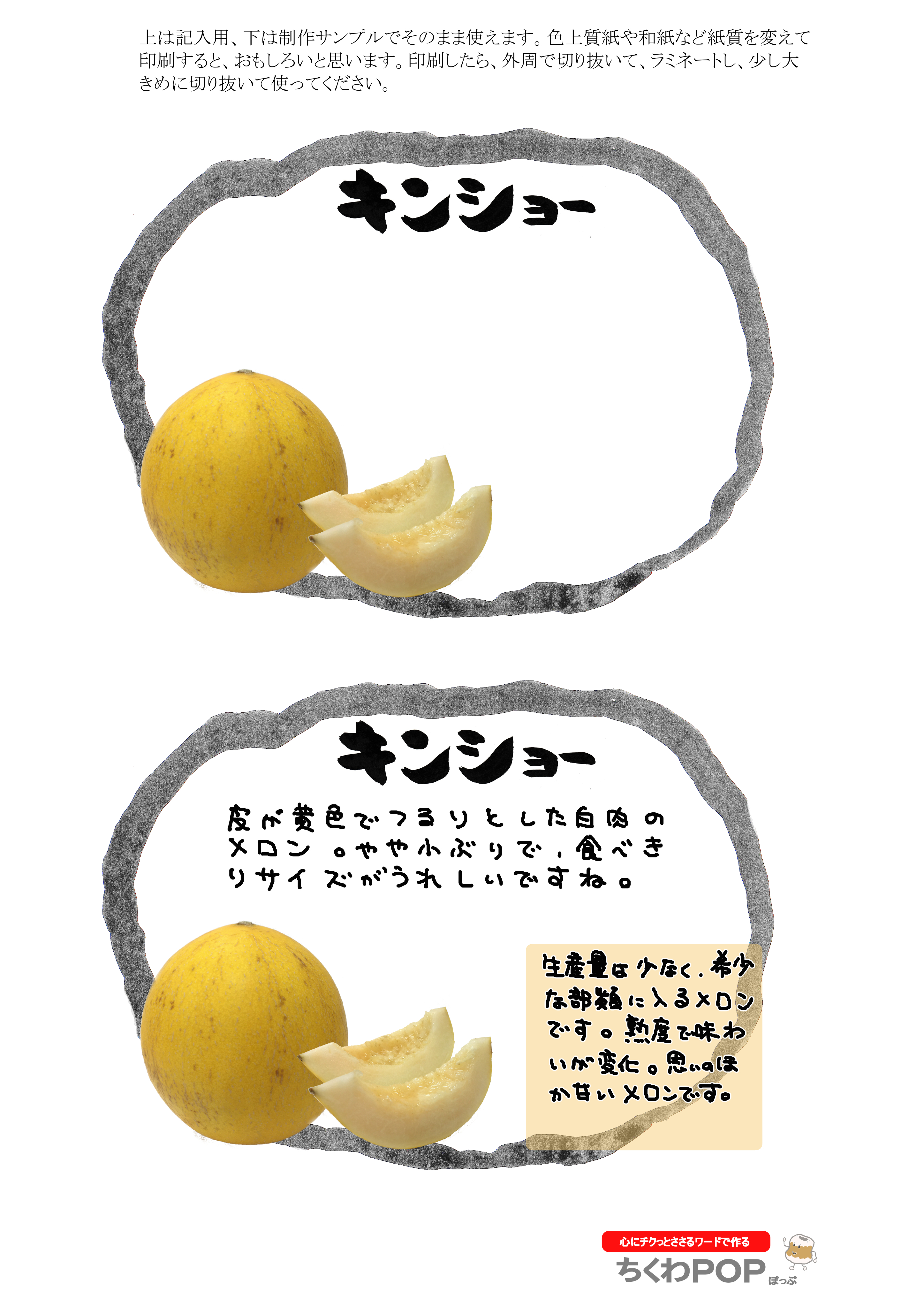 「今日のメロン」で検索してください。1枚にまとめて描き切ってしまうと、現物がない場合、あとあと困ることになりますよね。これなら簡単に差し替えができます。
