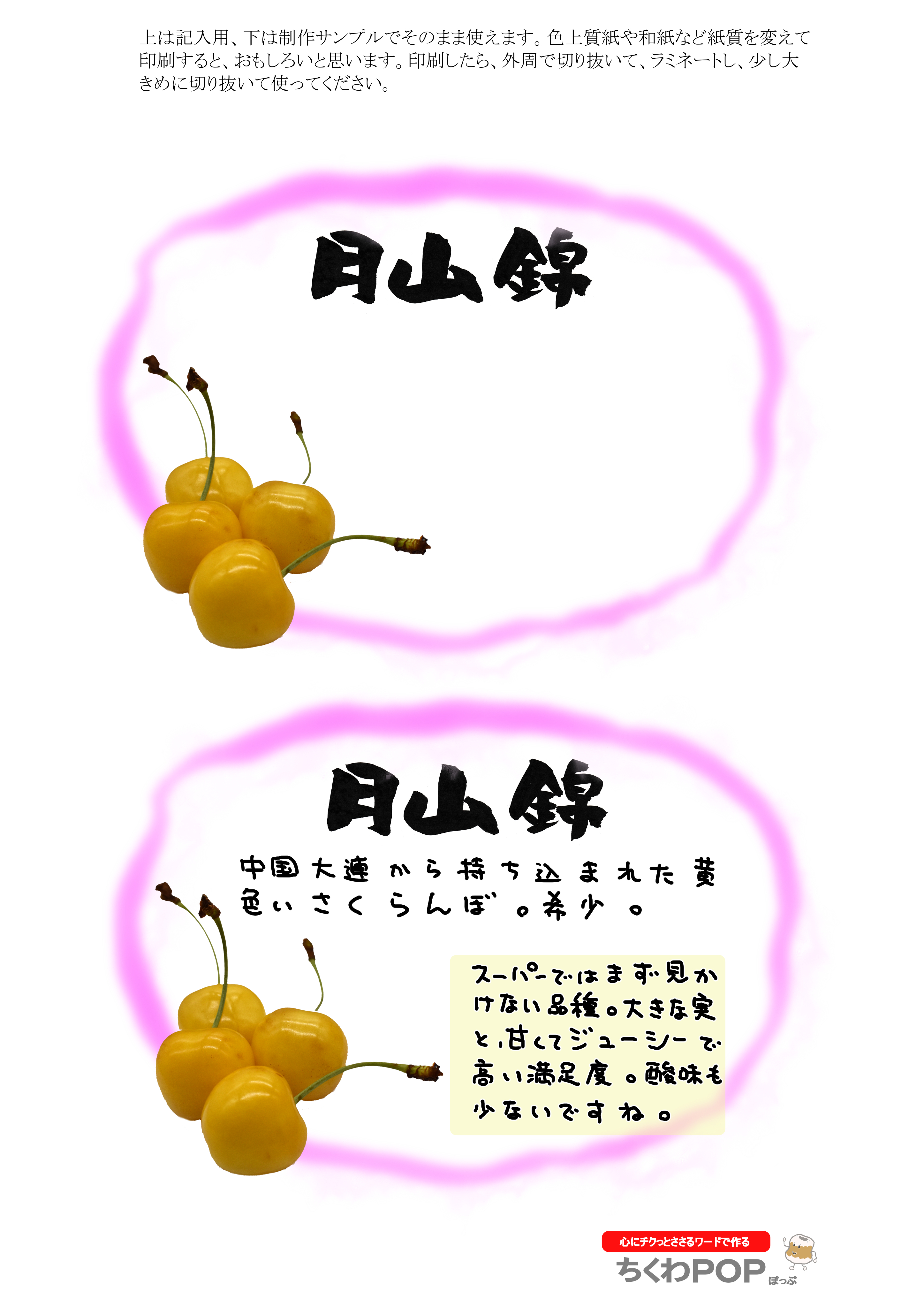 今日のさくらんぼシリーズの差し替え型ポップです。きれいな黄色で、さくらんぼ売り場での存在感はすごいです。