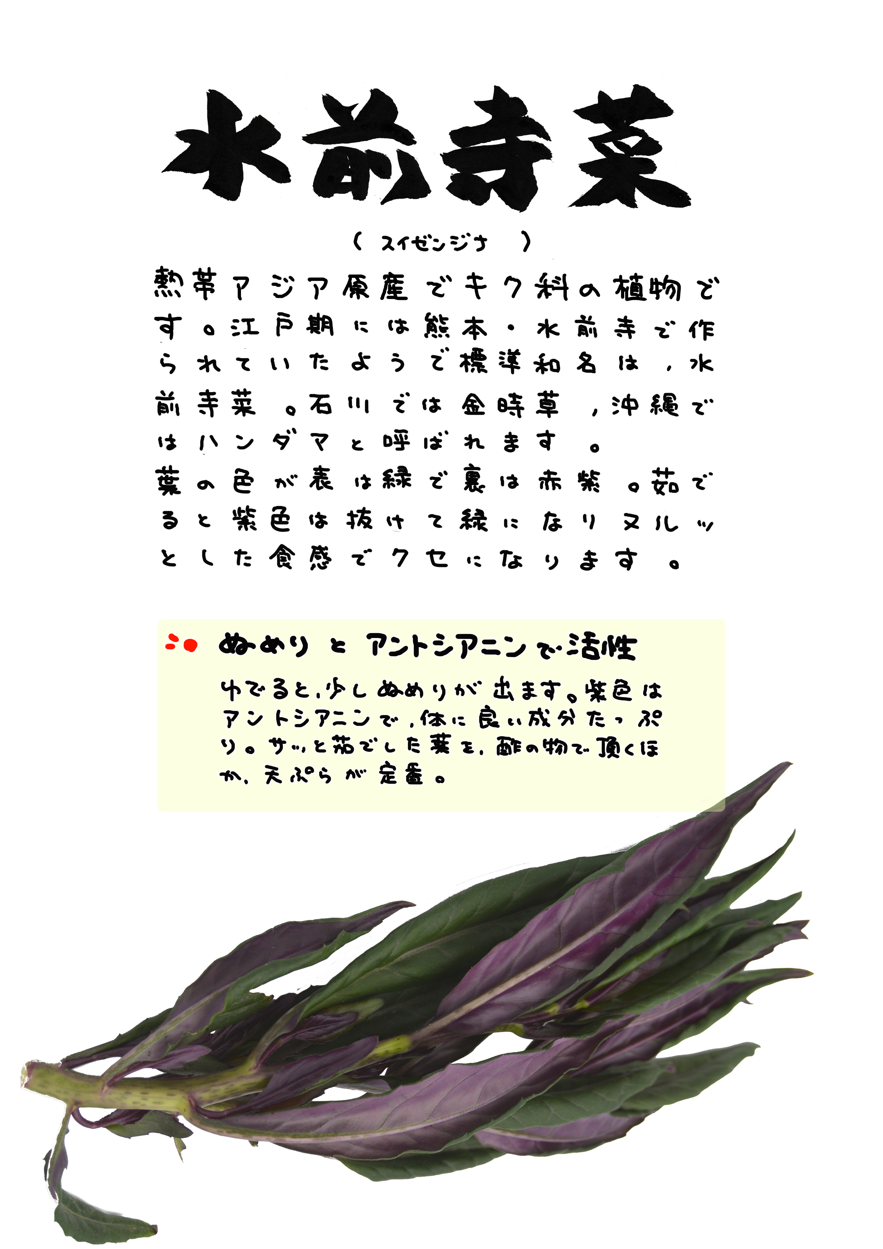 和名はスイゼンジナ。石川では「金時草」、熊本では「水前寺菜」、沖縄では「ハンダマ」、愛知では「式部草」と呼んでいるものです。